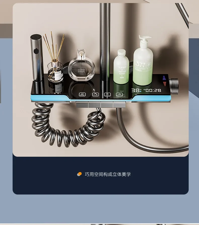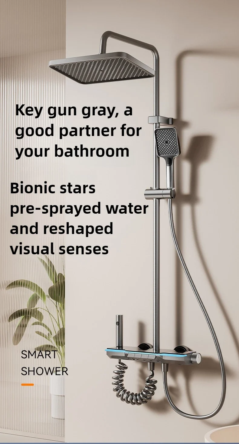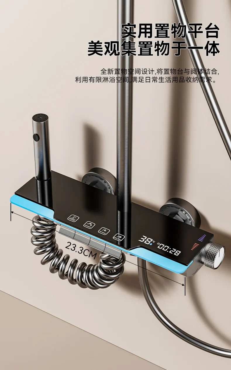 نظام دش حمام فاخر مثبت على الحائط طقم صنبور دش متعدد الوظائف مع رف تخزين منتجات جديدة مجموعة دش خلاط ذكي لعرض درجة الحرارة الرقمية حوض استحمام ساخن وبارد دش منزلي رمادي غير لامع كامل نظام دش حمام ذكي مع مصباح جو