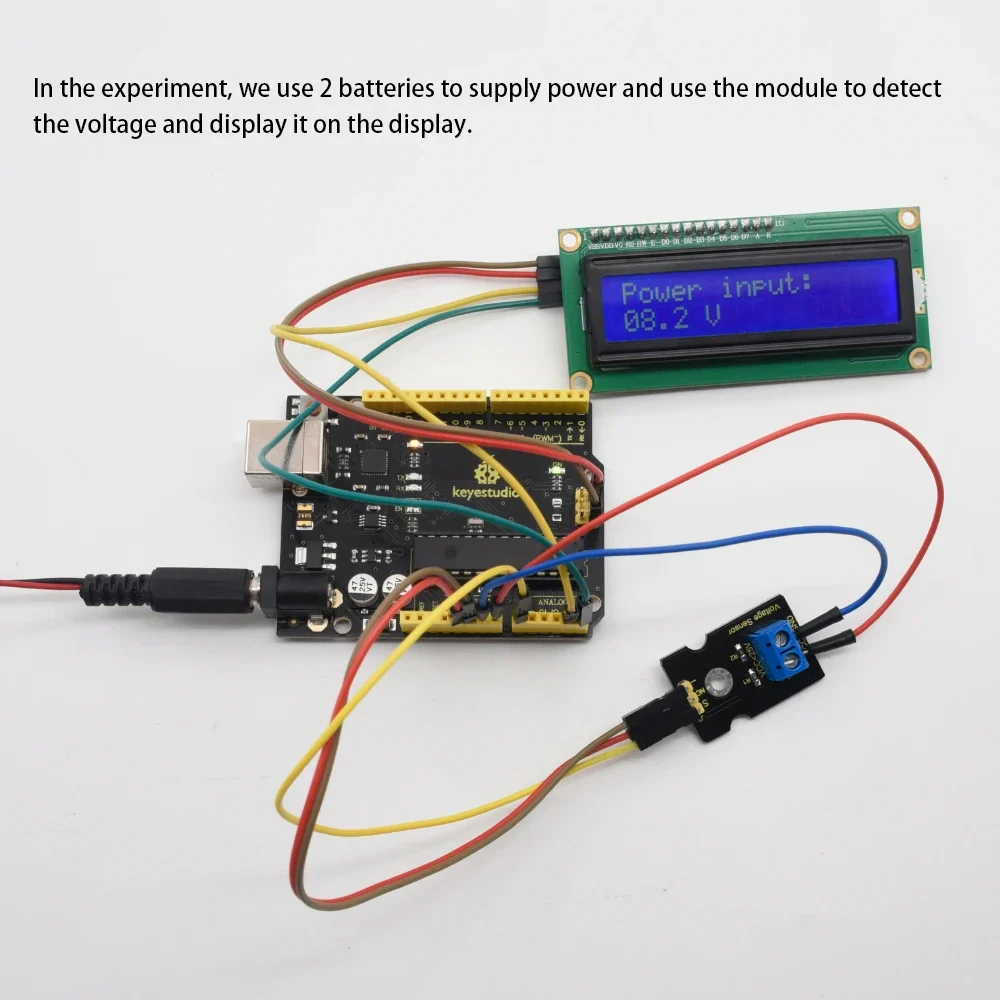 When connect this sensor to expansion board using 3Pin wire, it can not only easily detect the magnitude of the voltage power and monitor the electric quantity of battery for interactive media works or robot, but also can combine with IIC LCD1602 LCD module to display the voltage or make a voltage monitor.