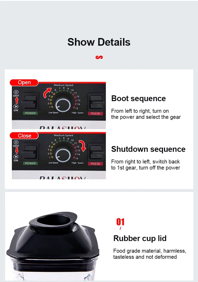 1.بمجرد استلام الخلاط، يرجى إضافة بعض الماء داخل الحاوية للاختبار، ولا تقم بتشغيله بدون أي شيء بالداخل لأنها تجربة سيئة لنظام التوصيل، ولا تطحن المكونات الجافة لأكثر من دقيقة واحدة.