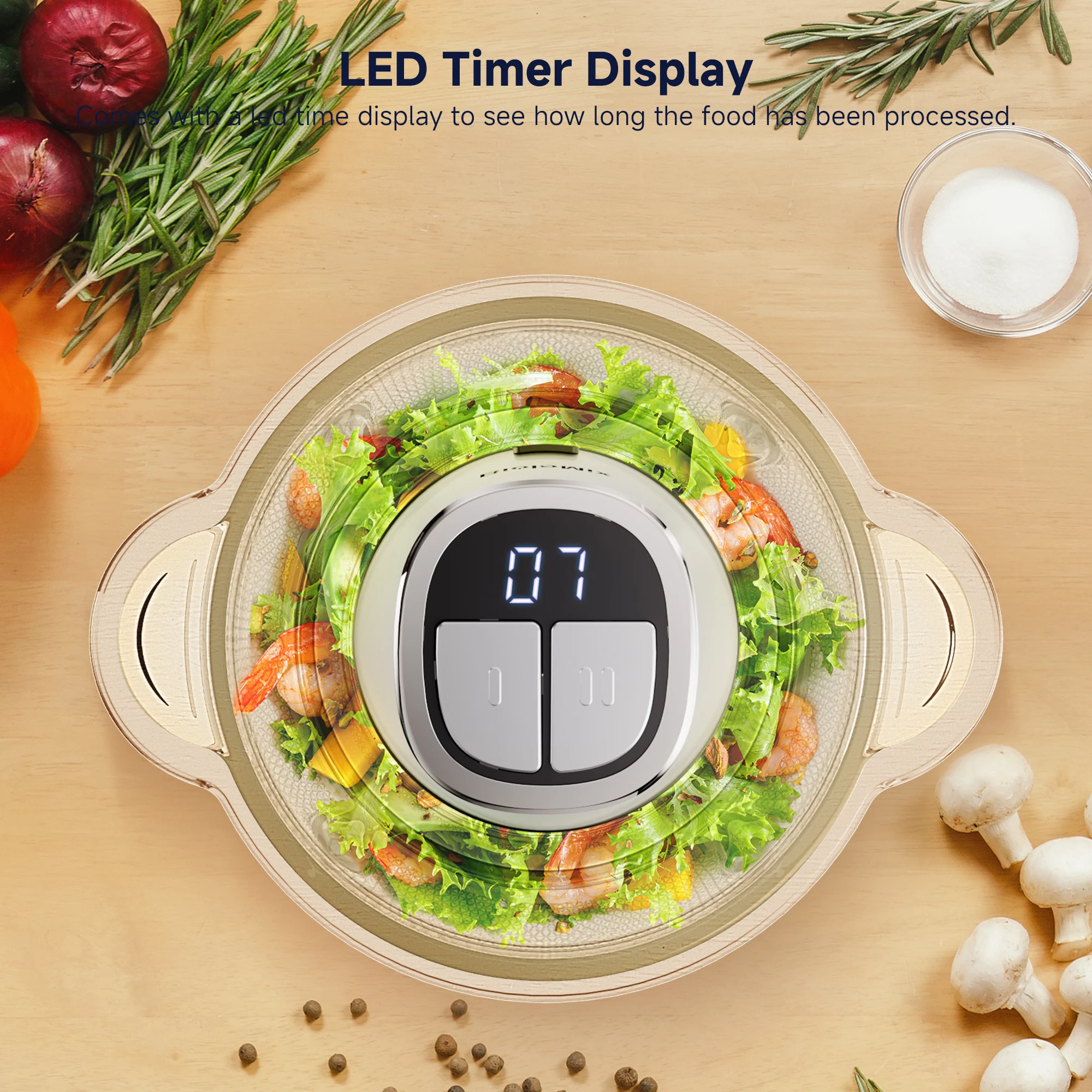 Processes up to 1kg ingredients. Equipped with an anti-slip rubber mat to stay stable and allowing you to easily wash the bowl in the dishwasher, making cleaning a breeze.