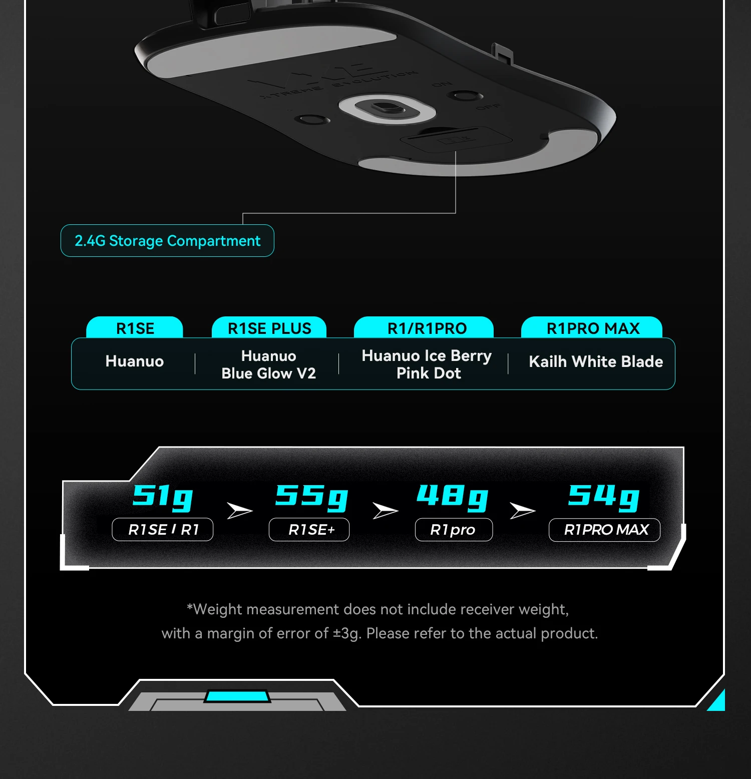 Weight: R1 SE/R1 (51g)/R1 PRO (48g)/R1 PROMAX (54g)