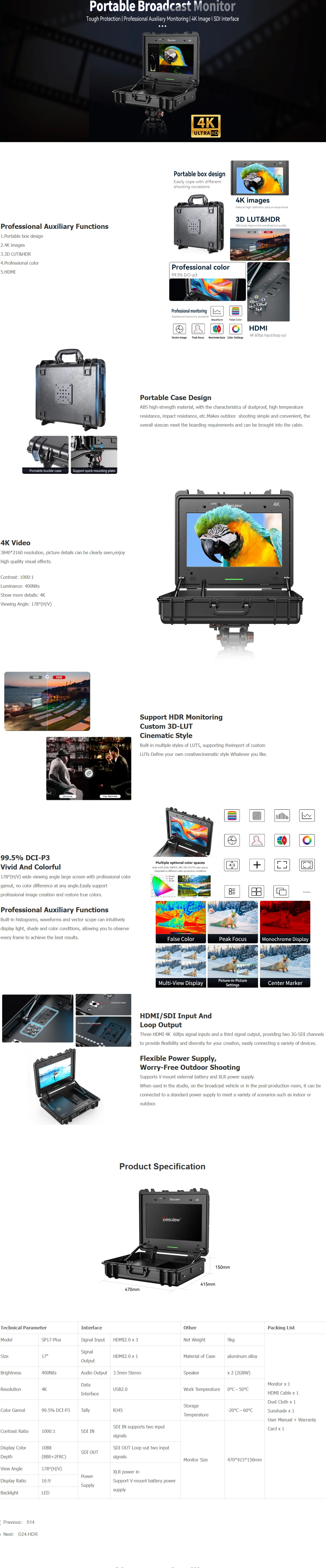 Bestview Desview SP17 PLUS Portable Broadcast Monitor Tough Protection Professional Auxiliary Monitoring 4K Image SDI Interface