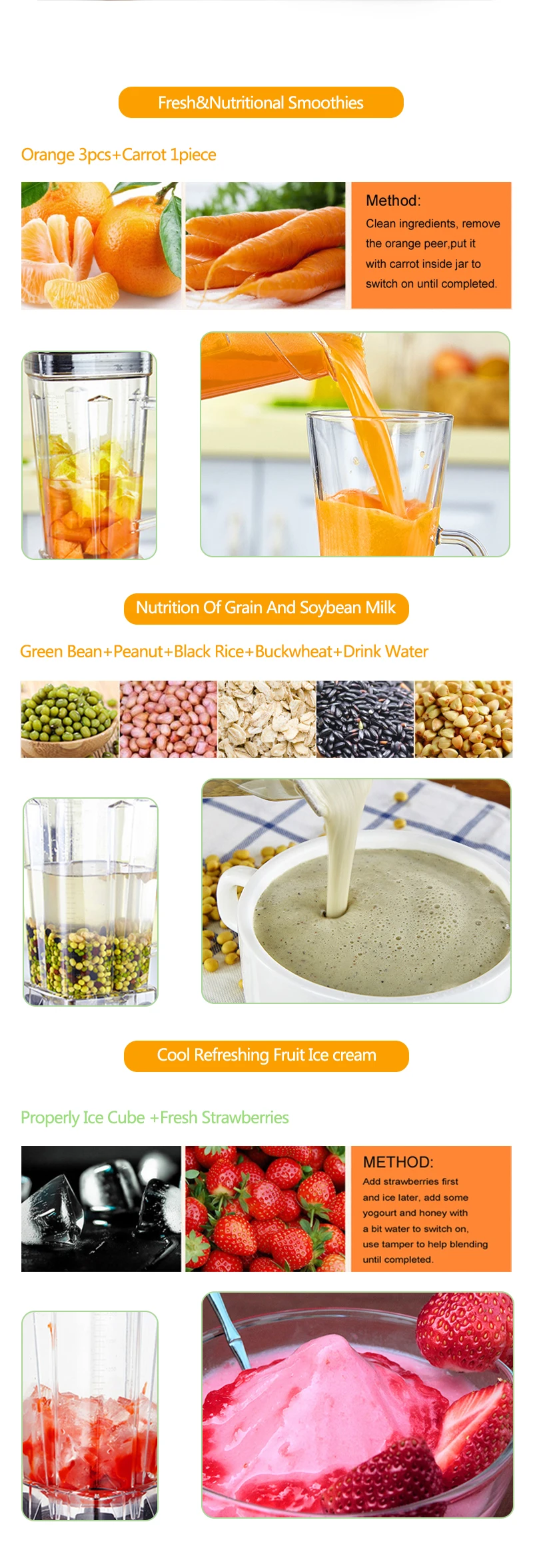 Make multiple drinks such as milkshakes, green smoothies, dry grinding,hot soup, sauces, raw food diet, ice cream, fresh juice and much more.