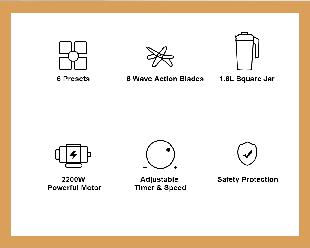 • 【What You Get】(1) 2200-peak-watt motor base, (1) 2L ( 1.6L Max) Square pitcher with lid and vented lid cap and 6 wave blades, (1)Tamper, and (1) User manual.