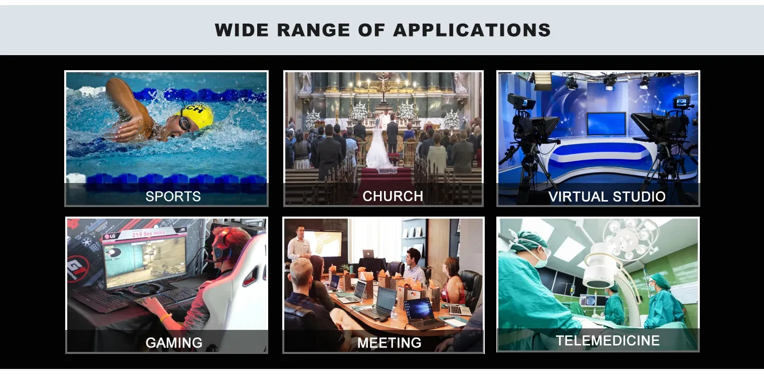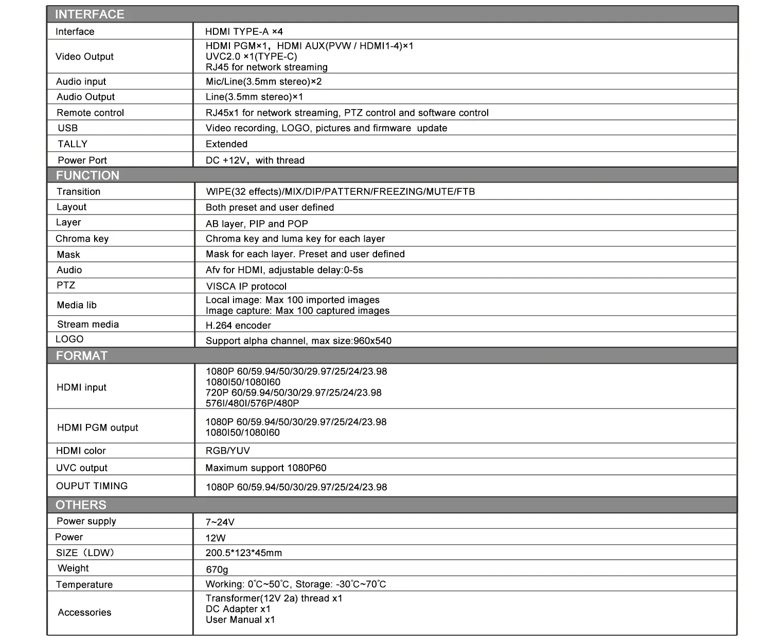 • Input video via four HDMI ports and output via one HDMI program and one auxiliary output, one UVC output, and one RJ45 LAN port.