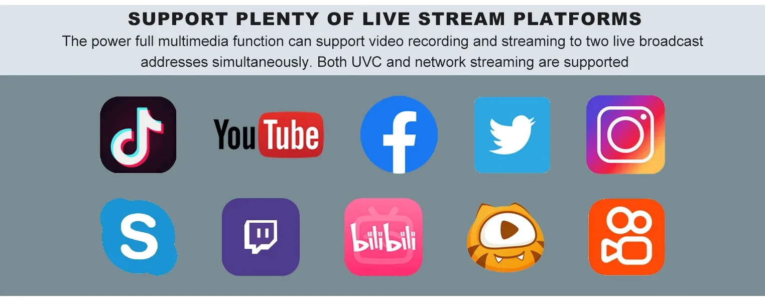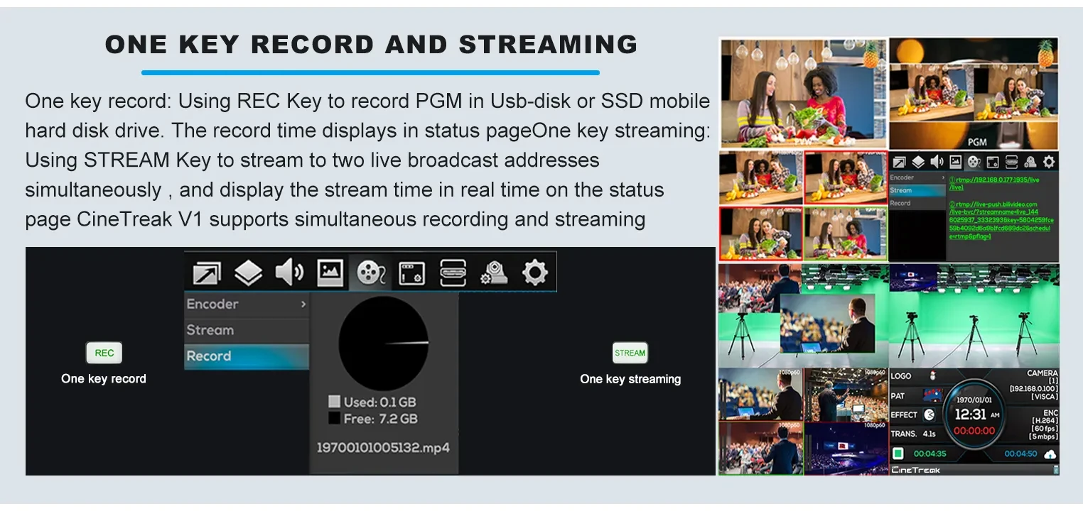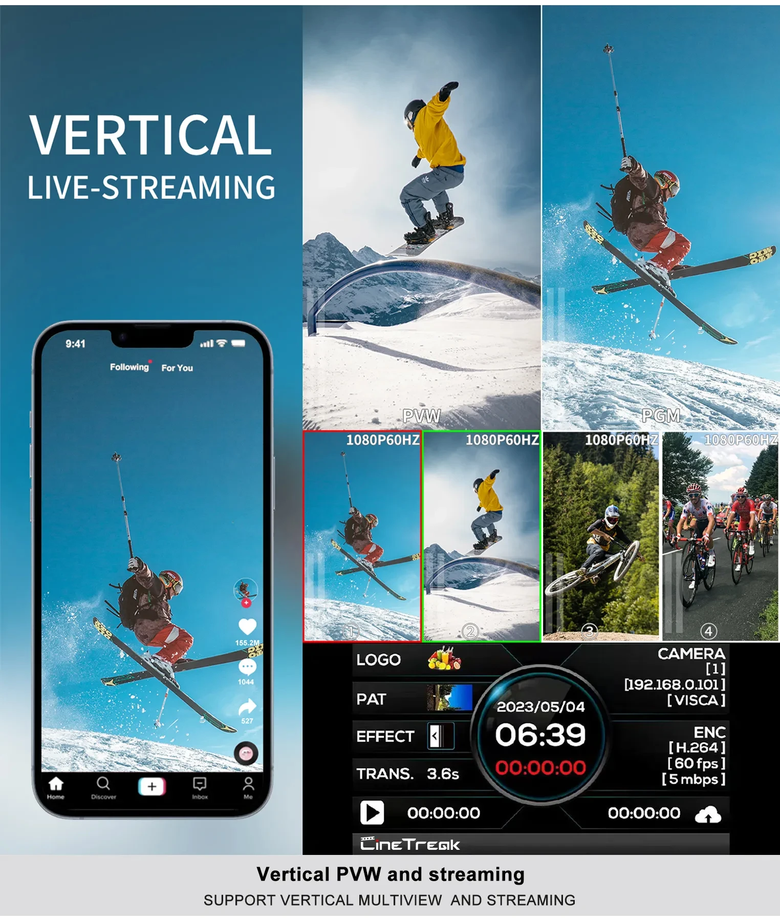 is a portable switcher with 30+ effects, chroma-keying, flexible positioning, vertical modes, a T-bar, media library, and a five-way rocker for PTZ camera control. It provides live streaming for up to 1080p60 video, multi-network streaming, and local video recording.