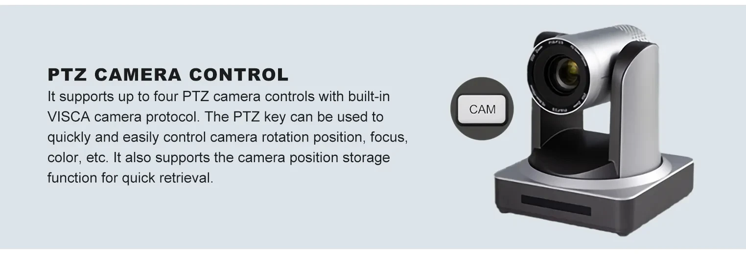 A five-way rocker switch provides agile PTZ camera control, including focus, white balance, and positioning.