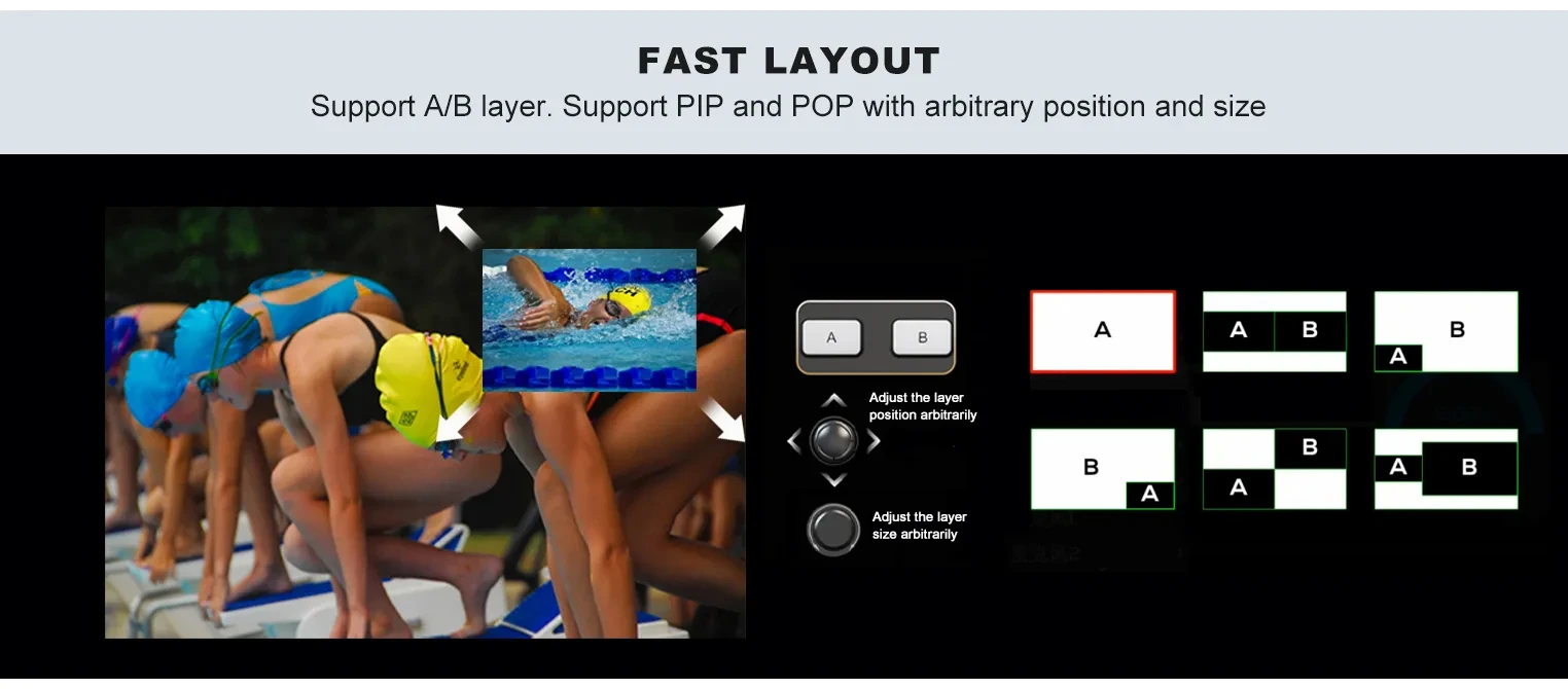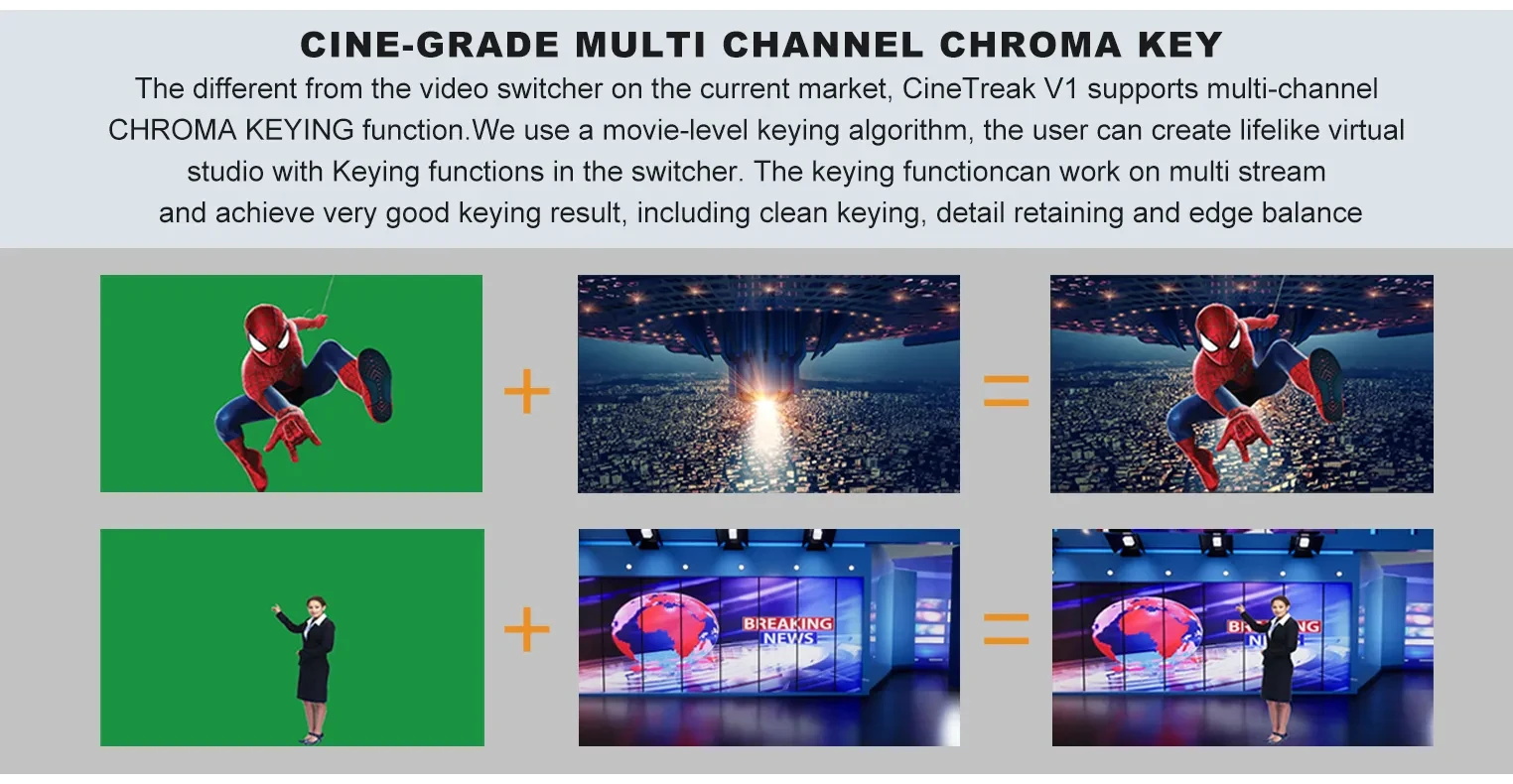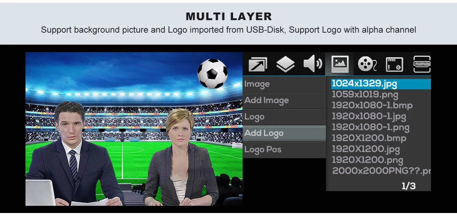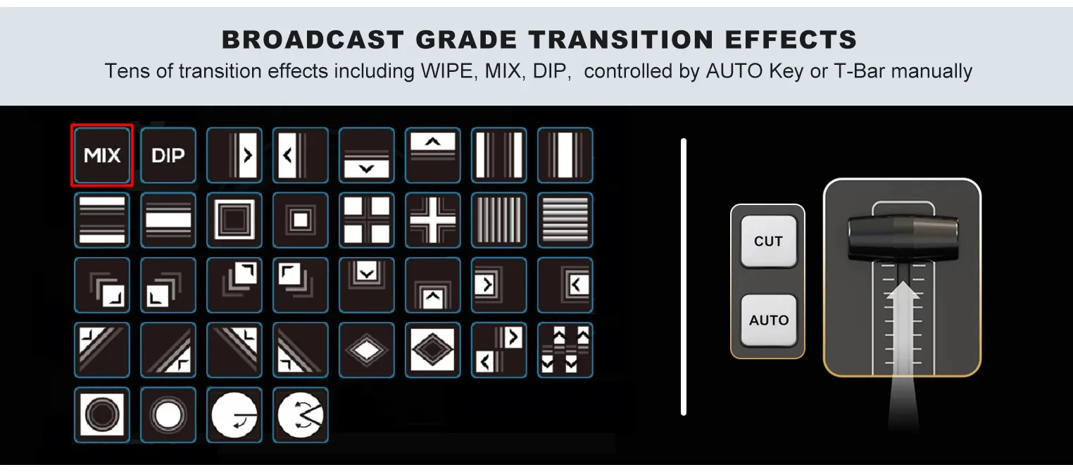 Over 30 video effects are supported by a T-bar, dial, and buttons. Flexible switching includes layers with adjustable position, size, chroma-key, and mask.