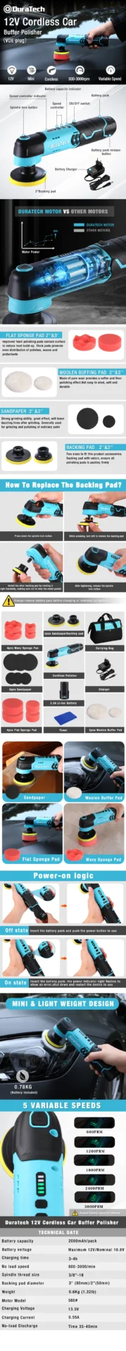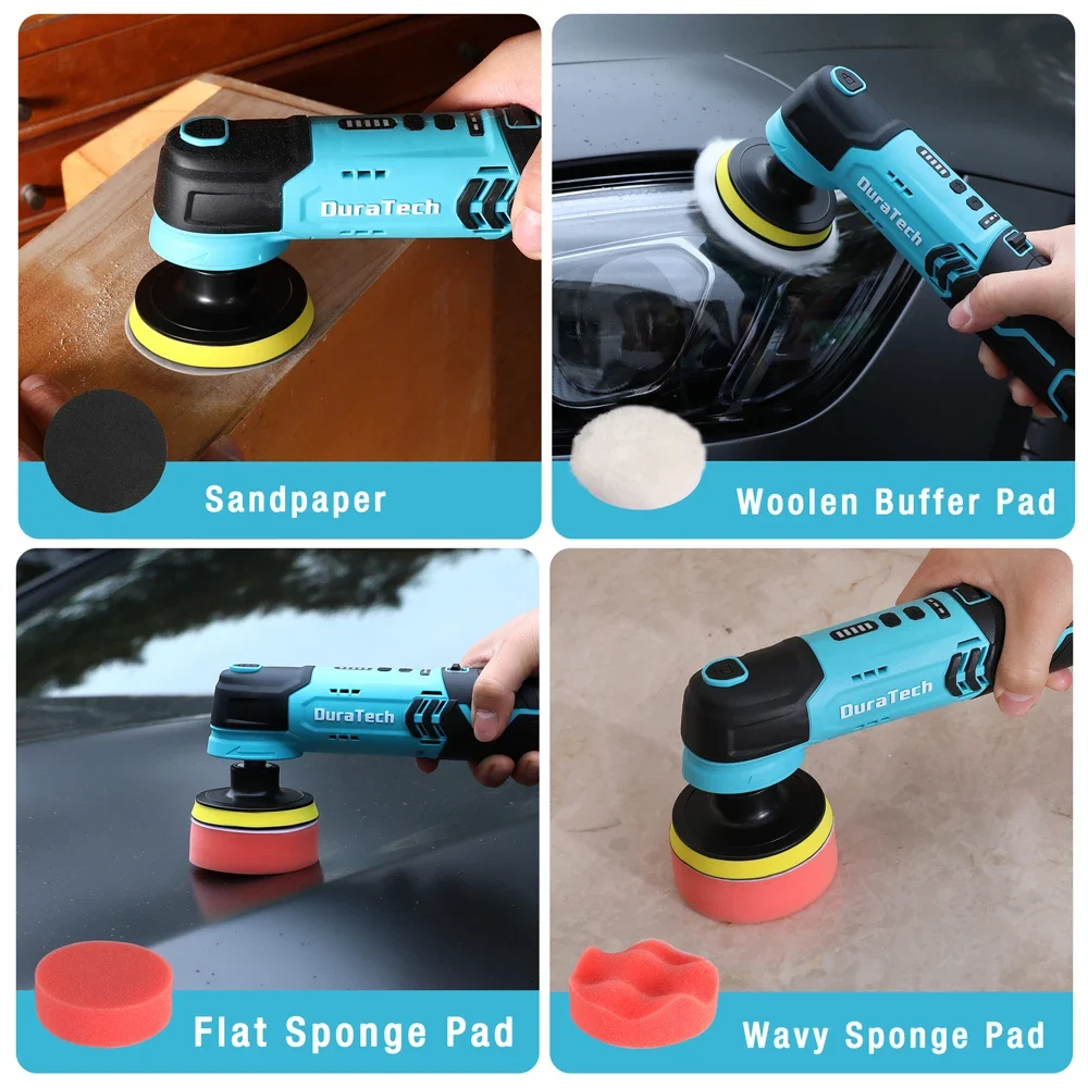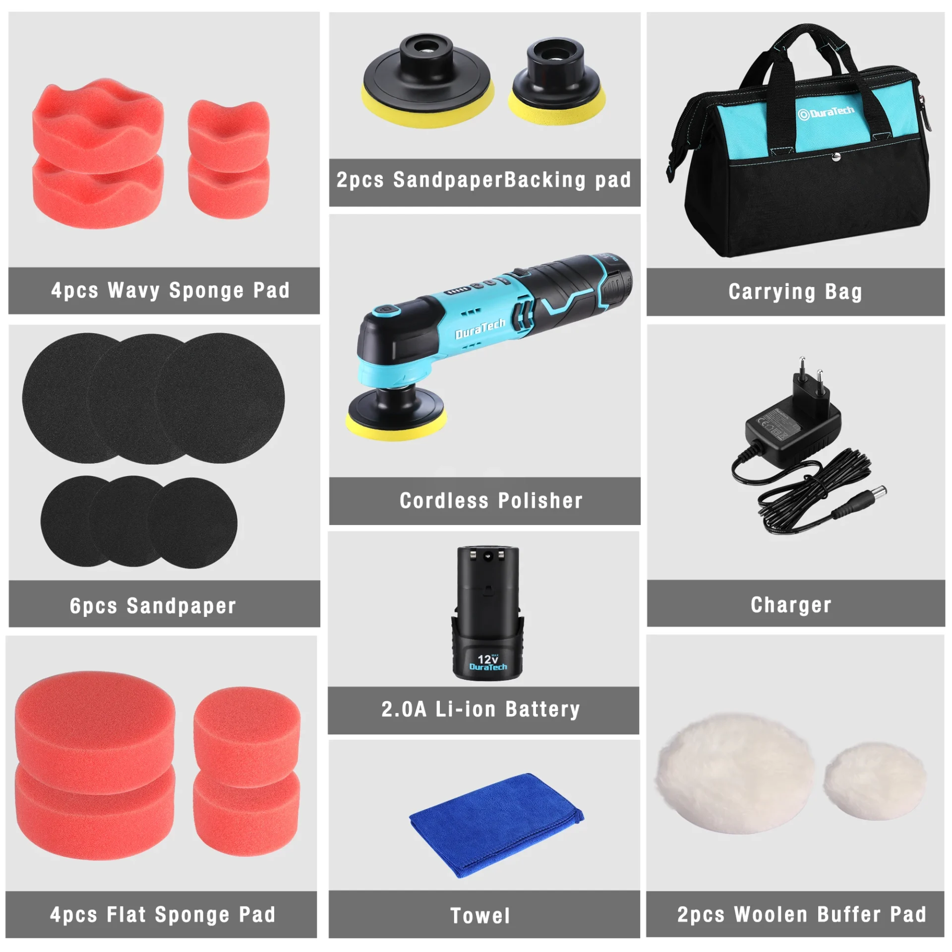 Duratech 12V Cordless Car Polisher Compact & Powerful 6-Speed Buffer with 2.0Ah Battery Full Detailing Kit for Car Care