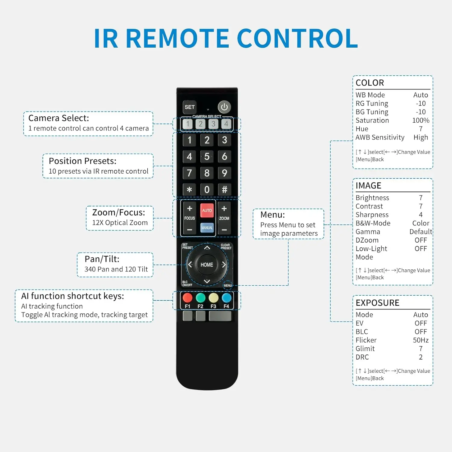 • 【Up to 255 Preset Positions】PoE support. 10 preset positions by IR remote controller,that can save pan, tilt, and zoom settings, and smoothly transitions between them at the touch of a button. Up to 255 preset positions via network control or keyboard controller.