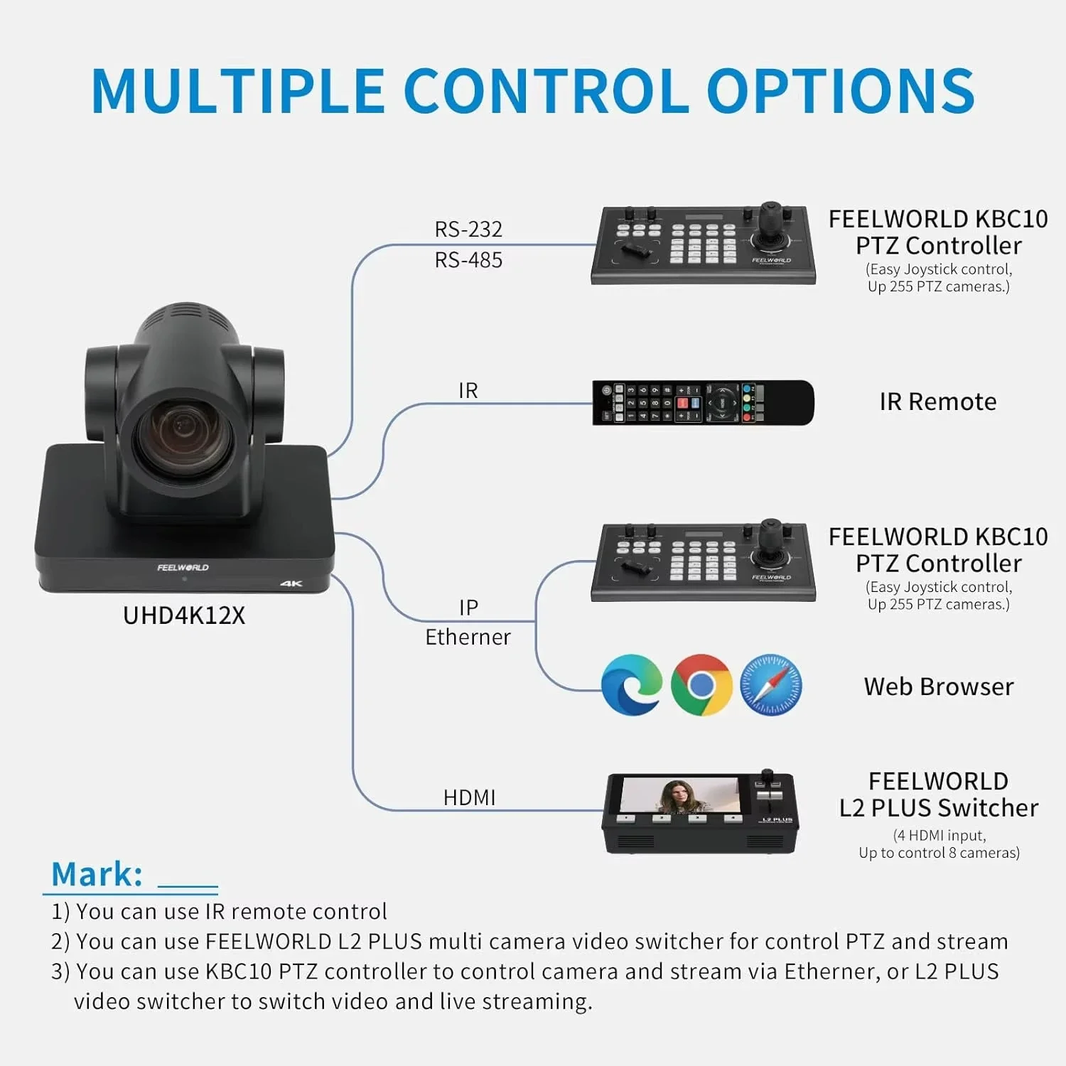 • 【Multi Control Ways】Can use hand-held remote, remote location with network control, FEELWORLD L2 PLUS video switcher or FEELWORLD KBC10 keyboard controller to control. 【Package Include】1× PTZ Camera, 1× Remote Control, 1× USB3.0 Cable, 1× RS232 Control Cable, 1× RS422 Terminal Block, 1× Power Adapter, 1× Manual