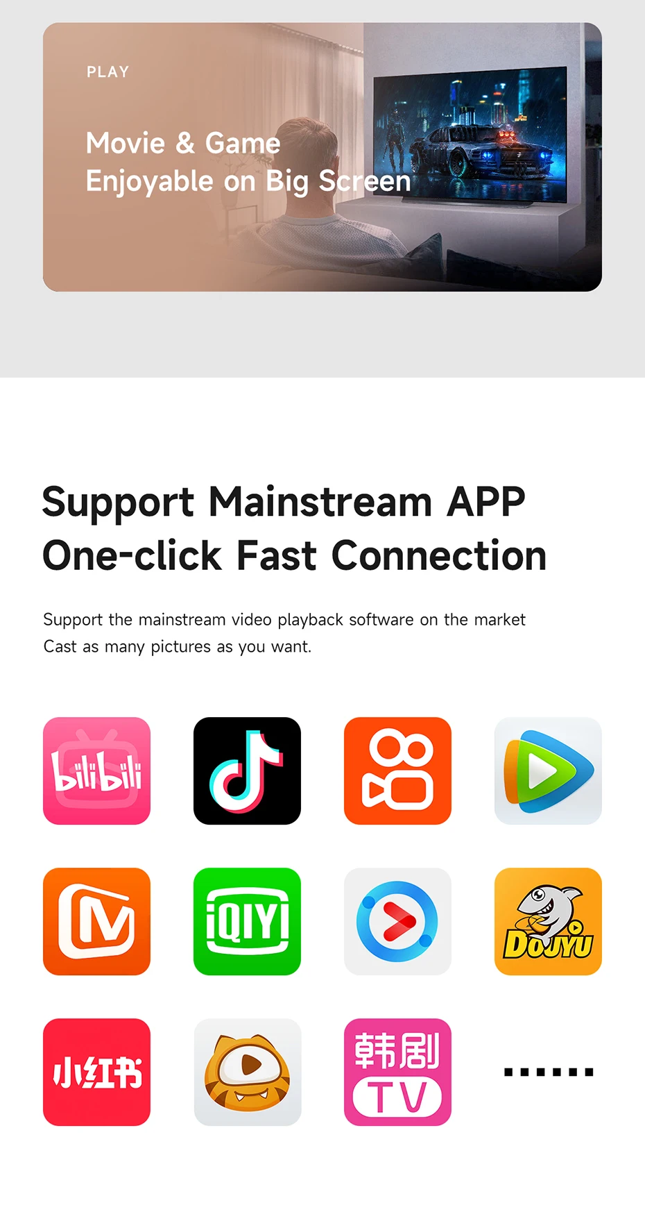 Note:Due to the limitation of the device system itself, Windows computer can support up to 4K/30Hz, For Apple computer only support up to 1080P/60Hz;For HarmonyOS, Android and Apple cell phones can support up to 1080P/60Hz in mirror mode and 4K/60Hz in push mode.