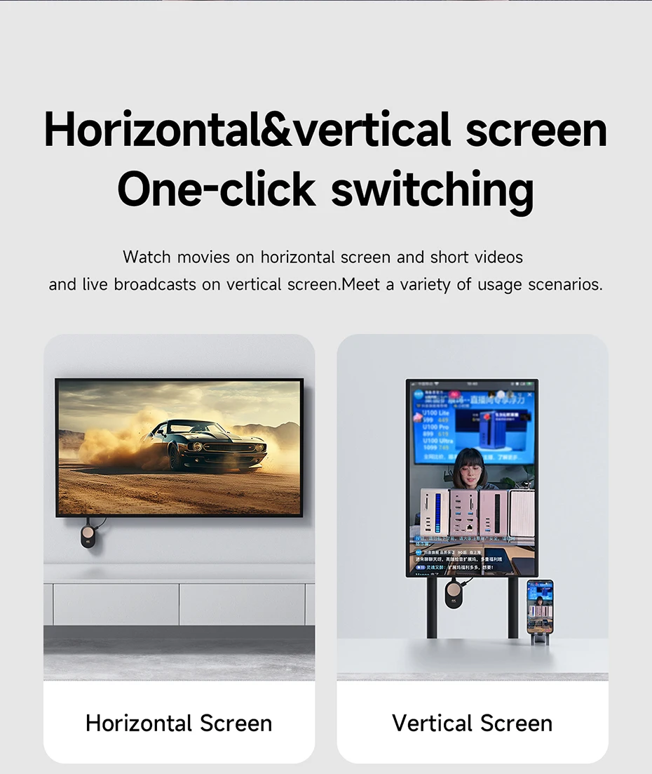 Horizontal & Vertical Screen: One-click to switch horizontal screen and vertical screen. Watch movies on horizontal screen, watch short videos and live broadcast on vertical screen. Meet a variety of usage scenarios