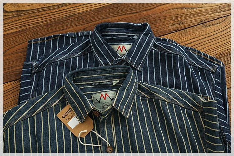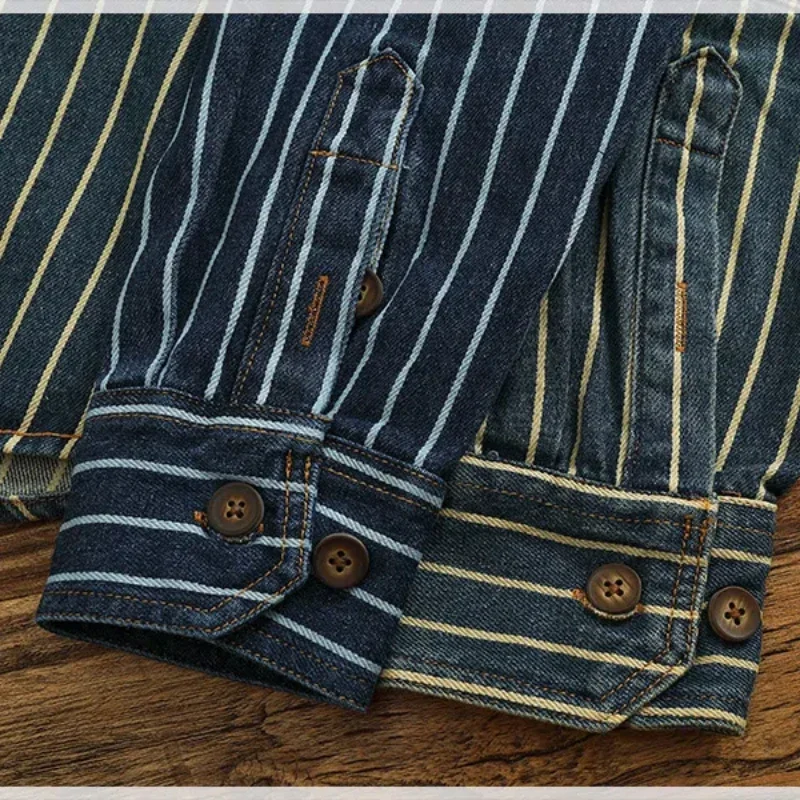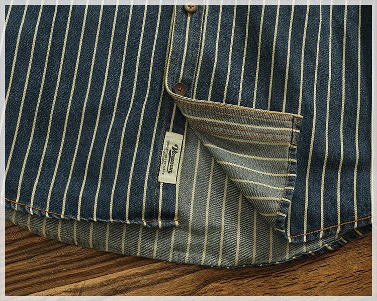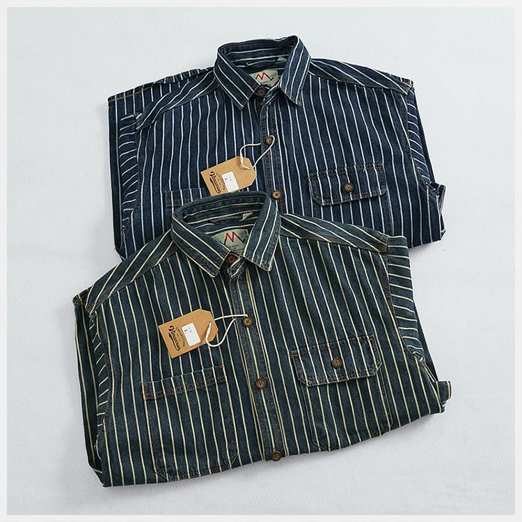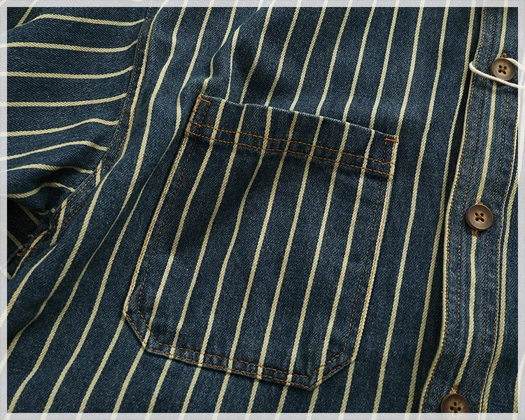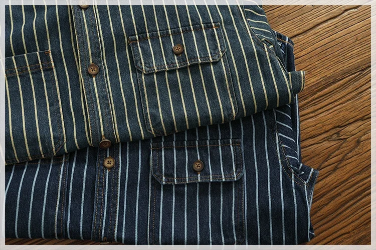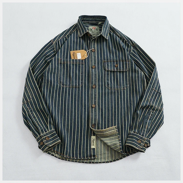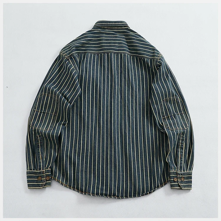 Heavy vertical stripe cargo denim shirt Men do old washed cotton elbow stick cloth lapel long sleeve shirt jacket