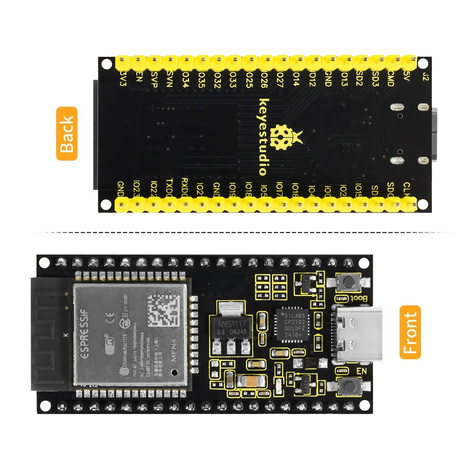 This Type-C connector keyestudio ESP32 core board is a Mini development board based on the ESP-WROOM-32 module.