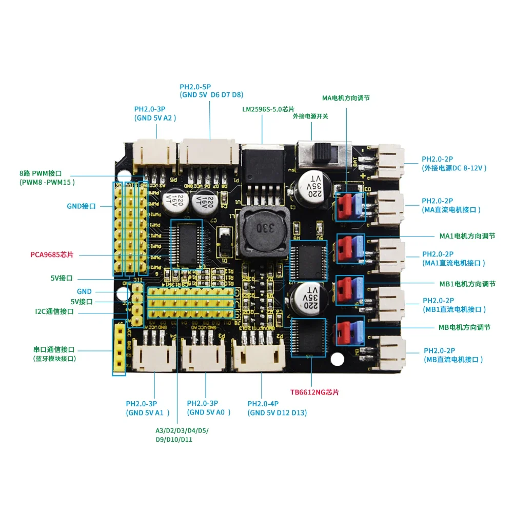 5. Driver board comes with 5 PH2.0mm-2P anti-reverse interfaces for external power and 4 motors; 3 PH2.0mm-3P, 1 PH2.0mm-4P and 1 PH2.0mm-5P interfaces for connecting to sensors/ modules.