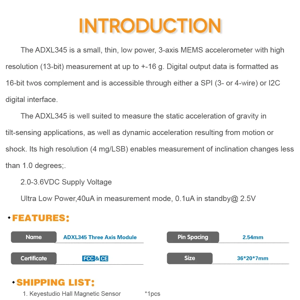 keyestudio ADXL345 Three Axis Acceleration Module for Precise Motion and Inclination Measurement For Arduino Diy Education