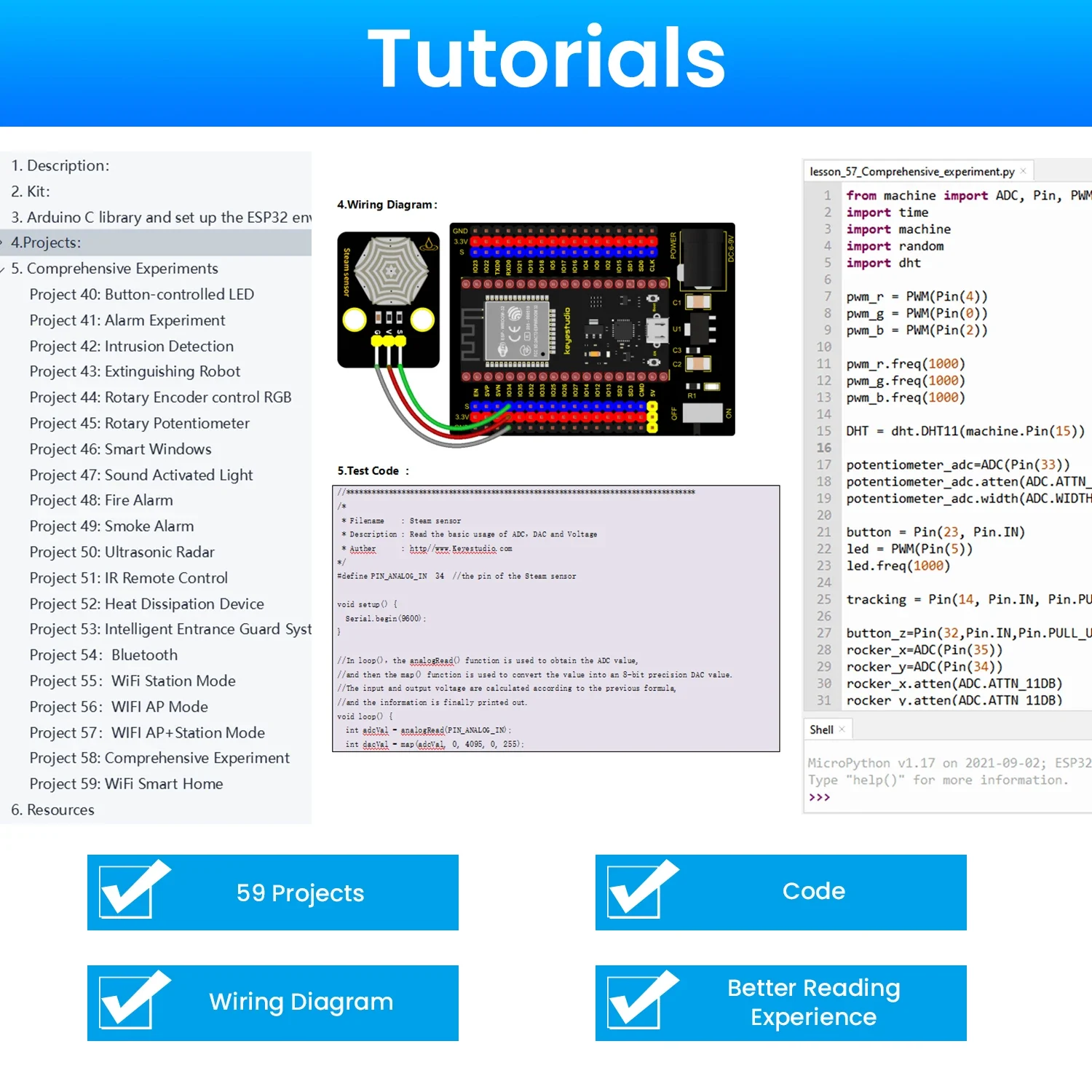 To make you master the electronic knowledge, detailed tutorials, schematic diagrams, wiring methods and test code are included.