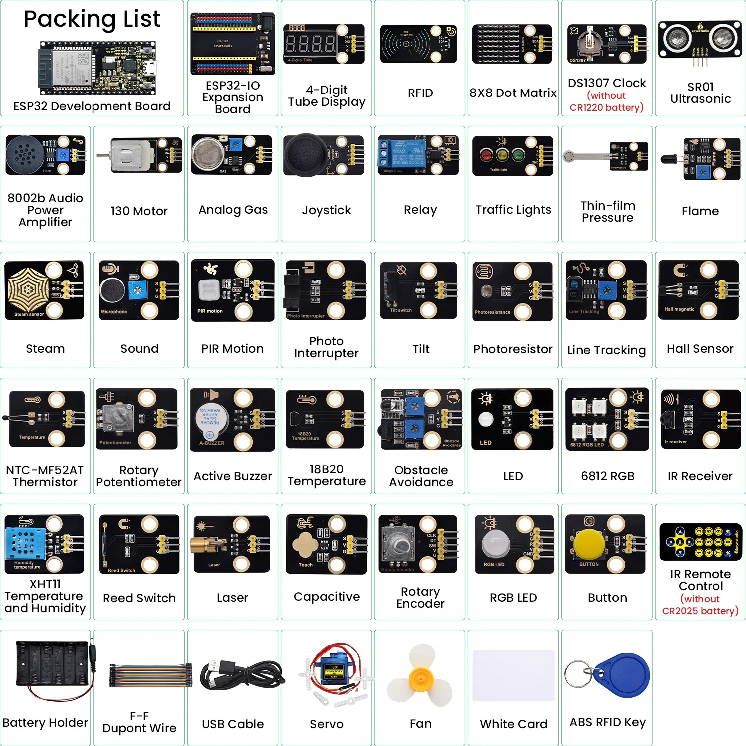 The Keyestudio ESP32 37 in 1 sensor kit mainly contains 37 commonly used sensors and modules, an ESP32 board, an ESP32 expansion board and Dupont wires.