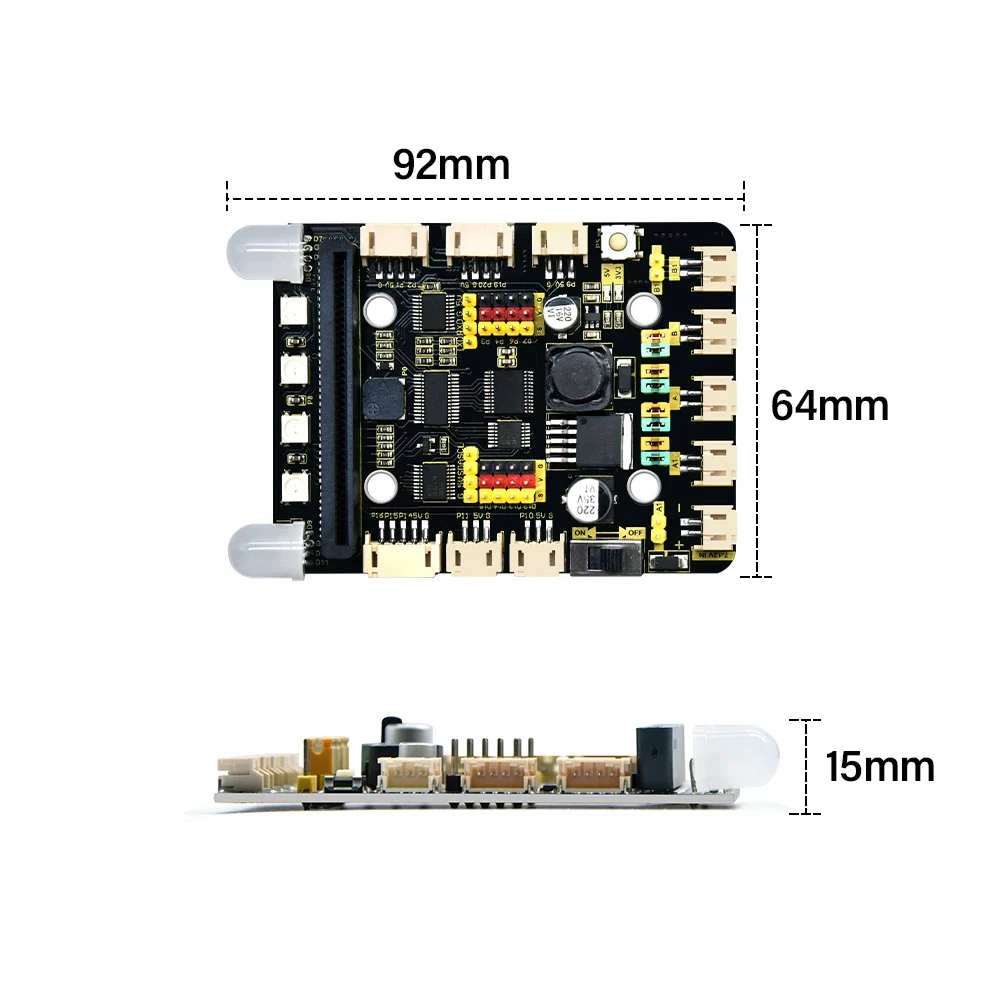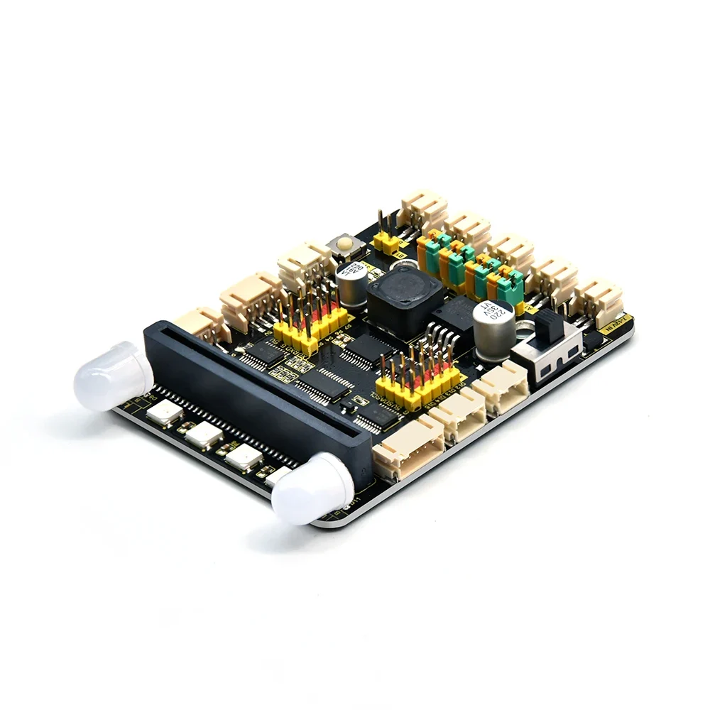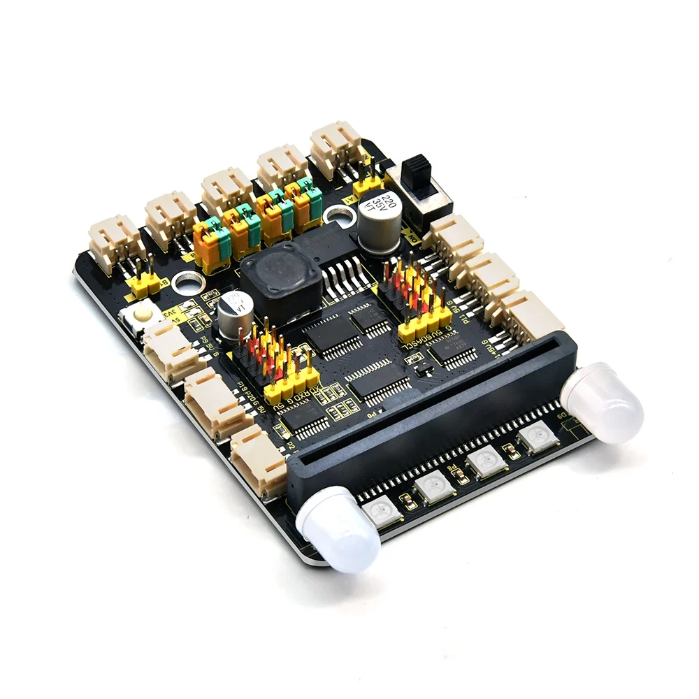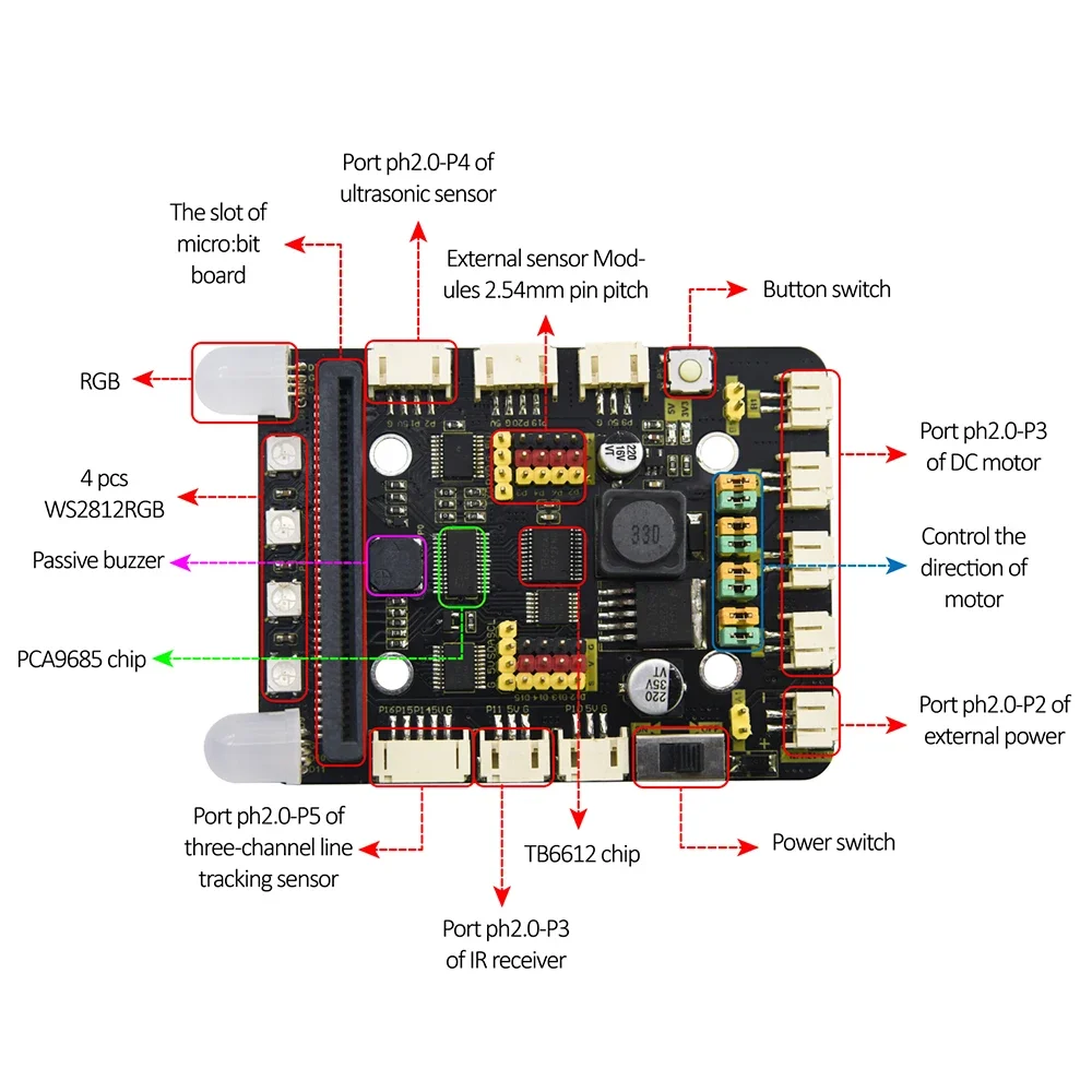 The TB6612FNG motor chip is used to control the rotation direction and speed of two DC gear motors. It also integrates 2 RGB lights, 4 WS2812RGB lights, a buzzer with a P2.0 ultrasonic interface, a P2.0 IR sensor interface and a P2.0 tracking sensor interface.