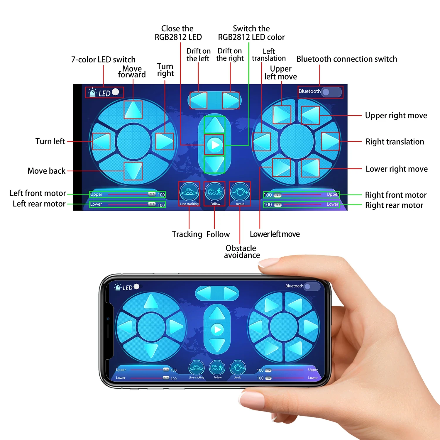 • Multi-purpose function: Obstacle avoidance,Following,IR remote control,APP control,Ultrasonic follow