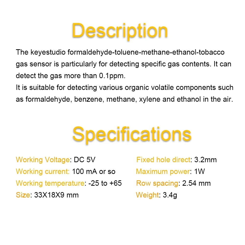 The keyestudio formaldehyde-toluene-methane-ethanol-tobacco gas sensor is particularly for detecting specific gas contents. It can detect the gas more than 0.1ppm.