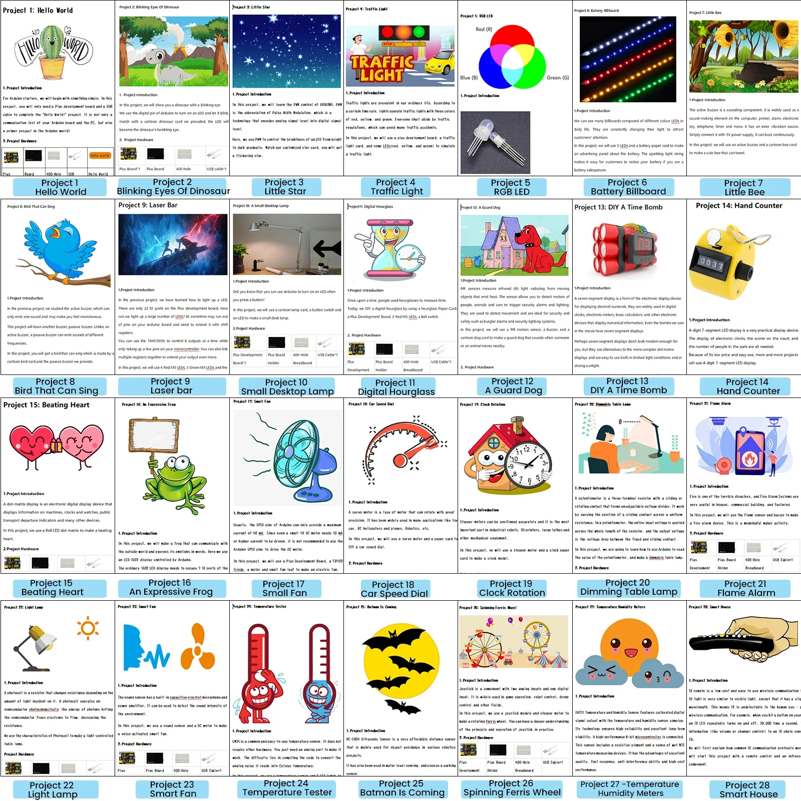 This kit also comes with 28 projects tutorials, which are entirely suitable for beginners. Each tutorial has detailed wiring diagrams and fascinating Project Codes. You can learn electronics, physics, science and programming knowledge.