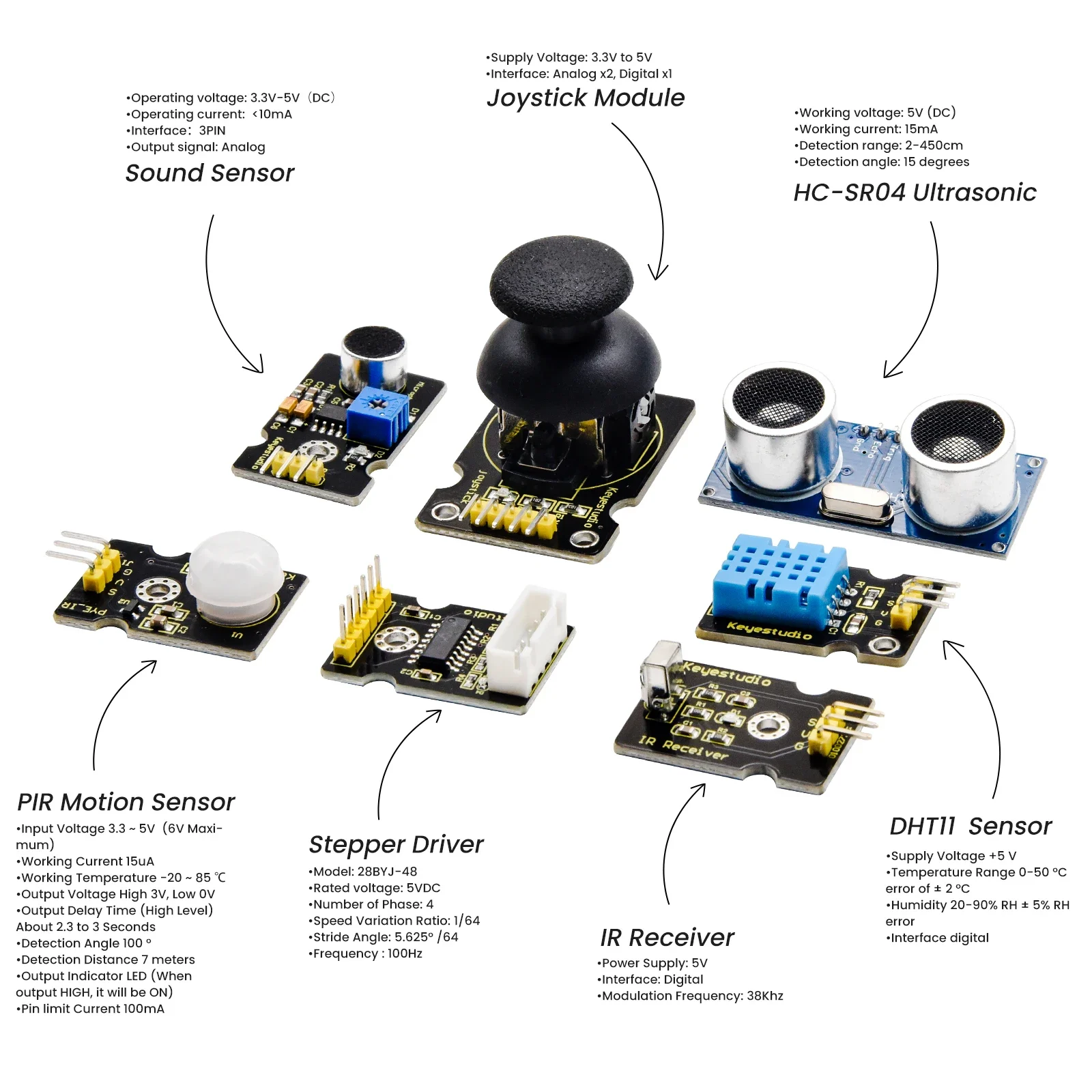 KEYESTUDIO STEM Starter Kit is a programming learning kit based on Arduino. With a controller, numerous sensors, modules and electronic components, you can do many different DIY projects.