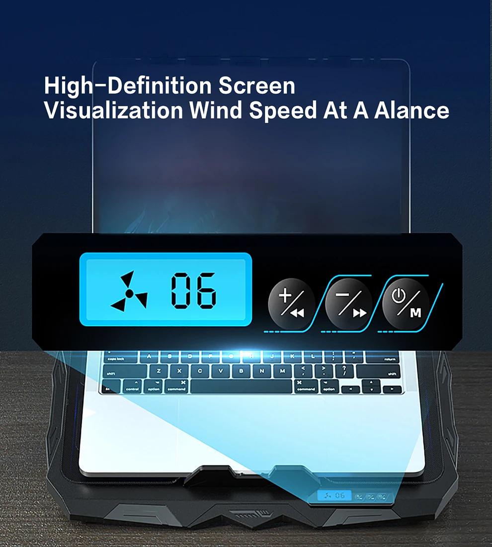 Laptop Cooling Stand 5 Height And 6 Wind Speed Adjustable For 17 Inch Notebook With 4 Fans Liquid Crystal Display And 2 USB PortAbout this itemsSuper Laptop Cooling Fans: laptop Cooling Pad with the mesh design and the 4 fans (140mm*2,70mm*2) spinning at adjustable speed from 2400-2600 RPM, greatly dissipate the heat from the laptop, enable it in good working condition, and prolong the lifespan of your laptop; four ultra-quiet fans create a noise-free environment for you !Ergonomic Laptop Cooler Stand: Five adjustable height settings to put the stand up or flat and hold your laptop in a suitable position. Two baffles prevent your laptop from sliding down or falling off; It’s not just a laptop Cooling Pad, but also a perfect laptop stand.LCD Display: The LCD of S18 cooler pad readout shows your current fan speed.simple and intuitive.you can easily control the fan speed by touching the buttons.Easy Operation & Two USB Ports: Laptop cooling stand just plug in the USB port of your laptop to use. Equipped with two USB 2.0 ports for data transmission or connecting to other devices, including one USB cable for you.Ultra Durability Laptop Cooler: The high-quality metal mesh provides your laptop with a wear-resisting and firm laptop carrying surface. This material can draw heat away from the laptop, and improve heat dissipation.Universal Compatibility: The light and portable laptop cooling pad works with most laptops up to 17 inches. Meet your needs when using a laptop home or office for work.