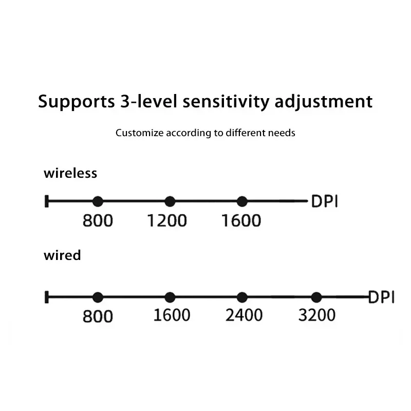 1.3 Adjustable DPI :The mouse has 3 adjustable DPI settings of 800, 1200, and 1600, allowing you to customize your mouse speed and accuracy.