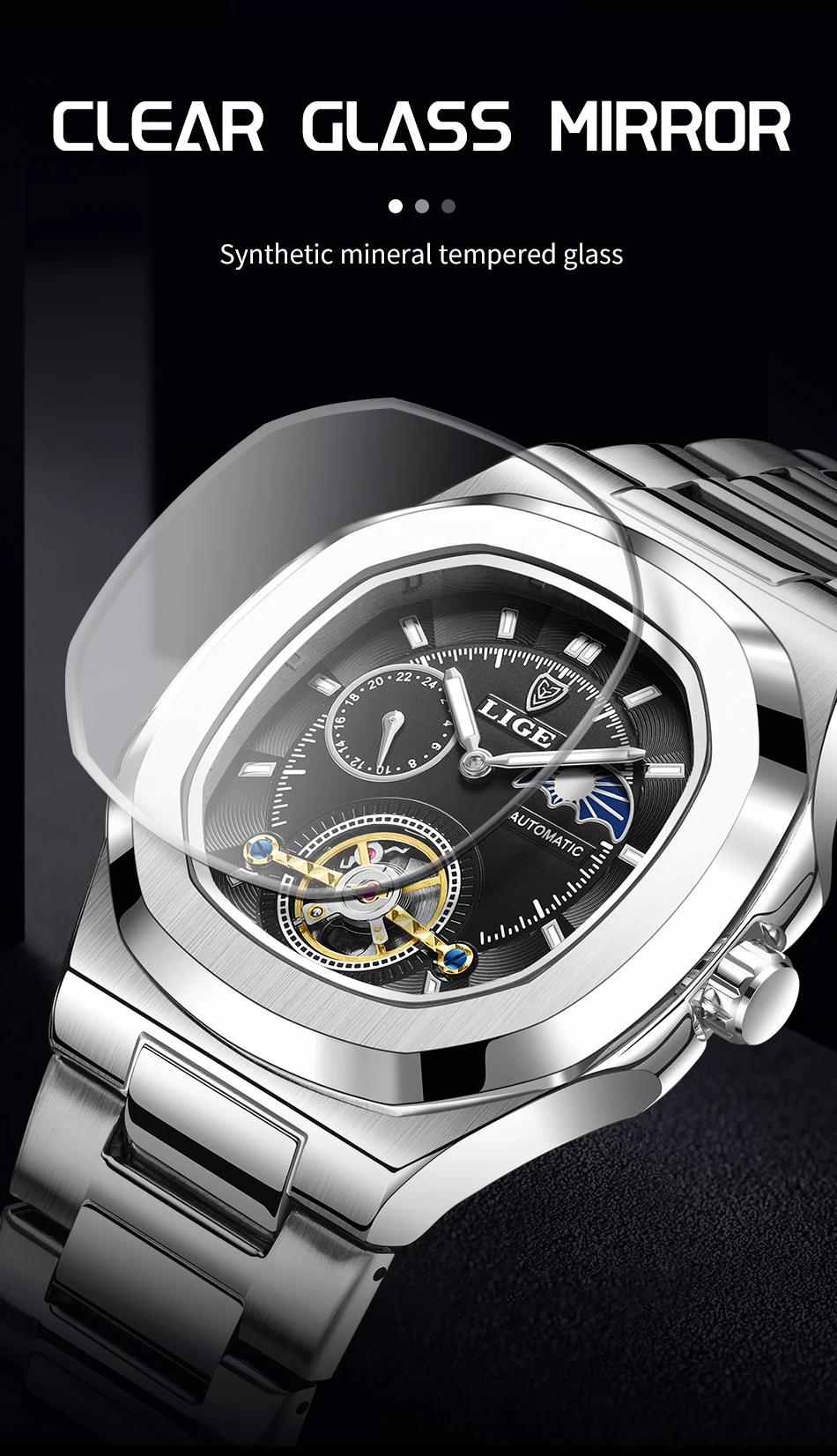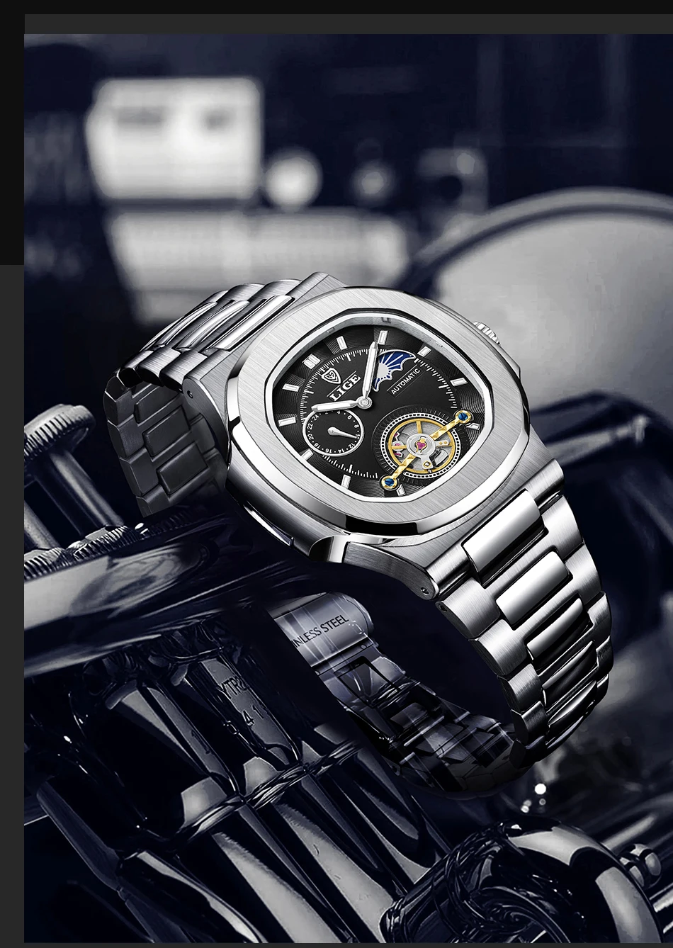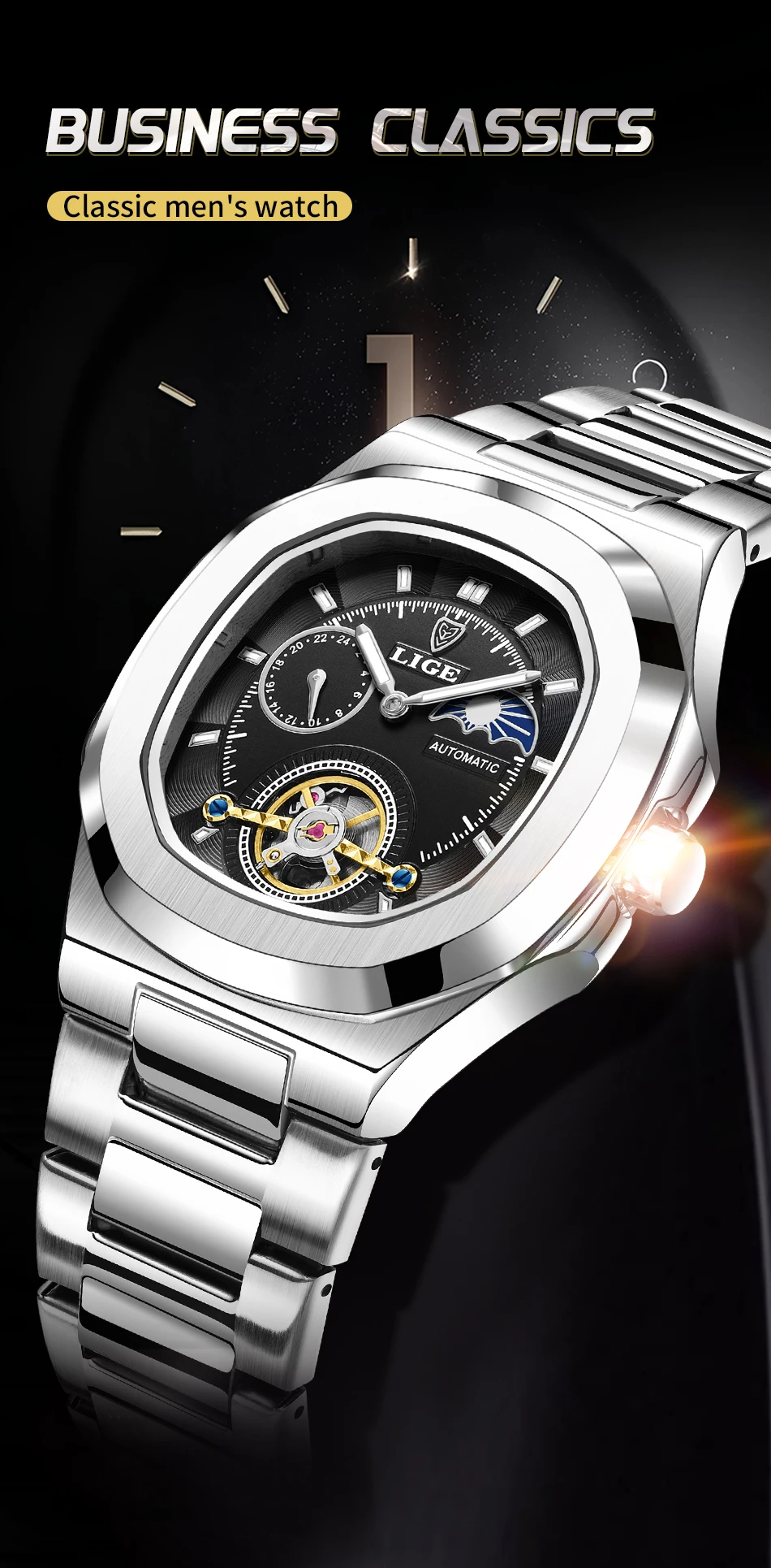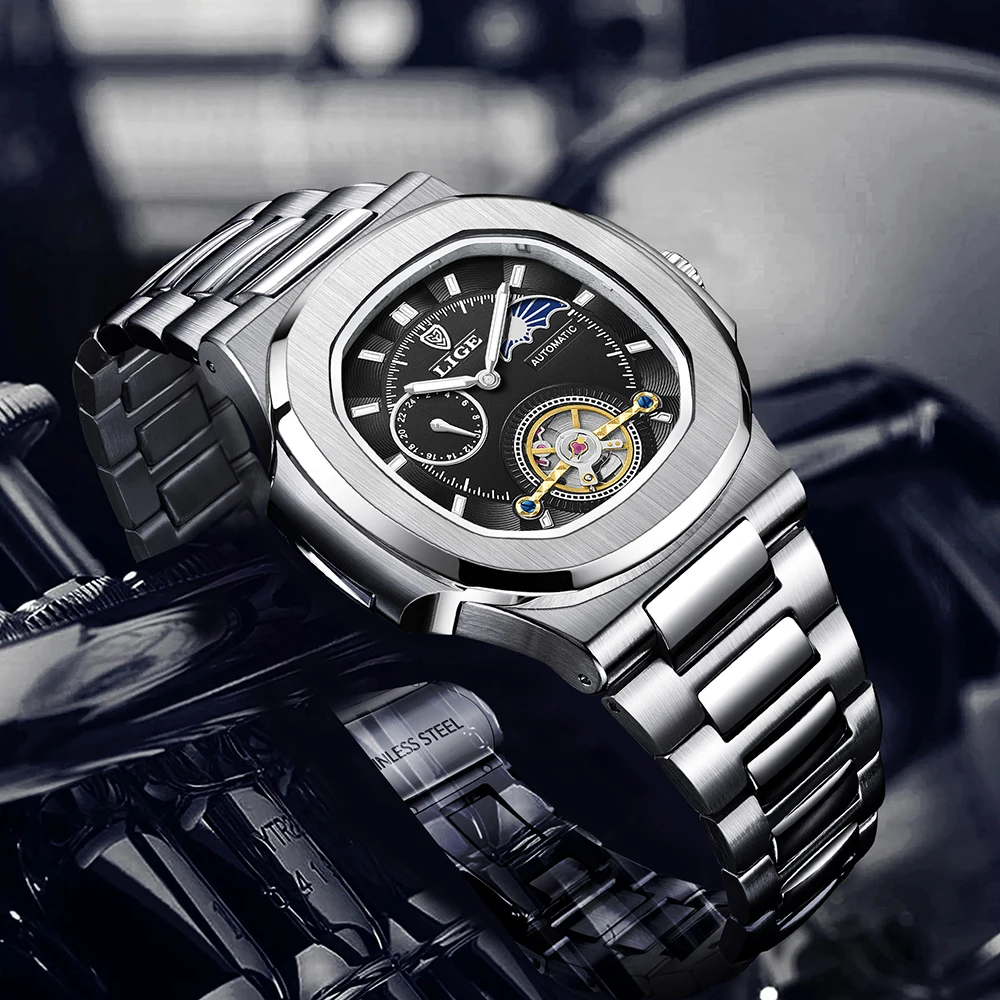 LIGE Dual Seconds Tourbillon Watch 24 Hour Mechanical Watch Men Stainless Steel Authentic Watch Night Glow Waterproof Mens Watch