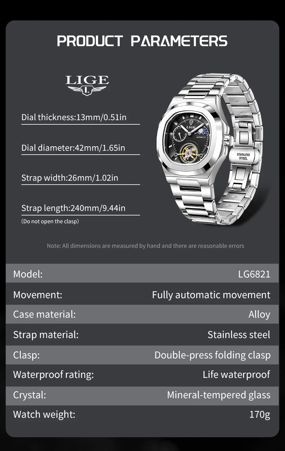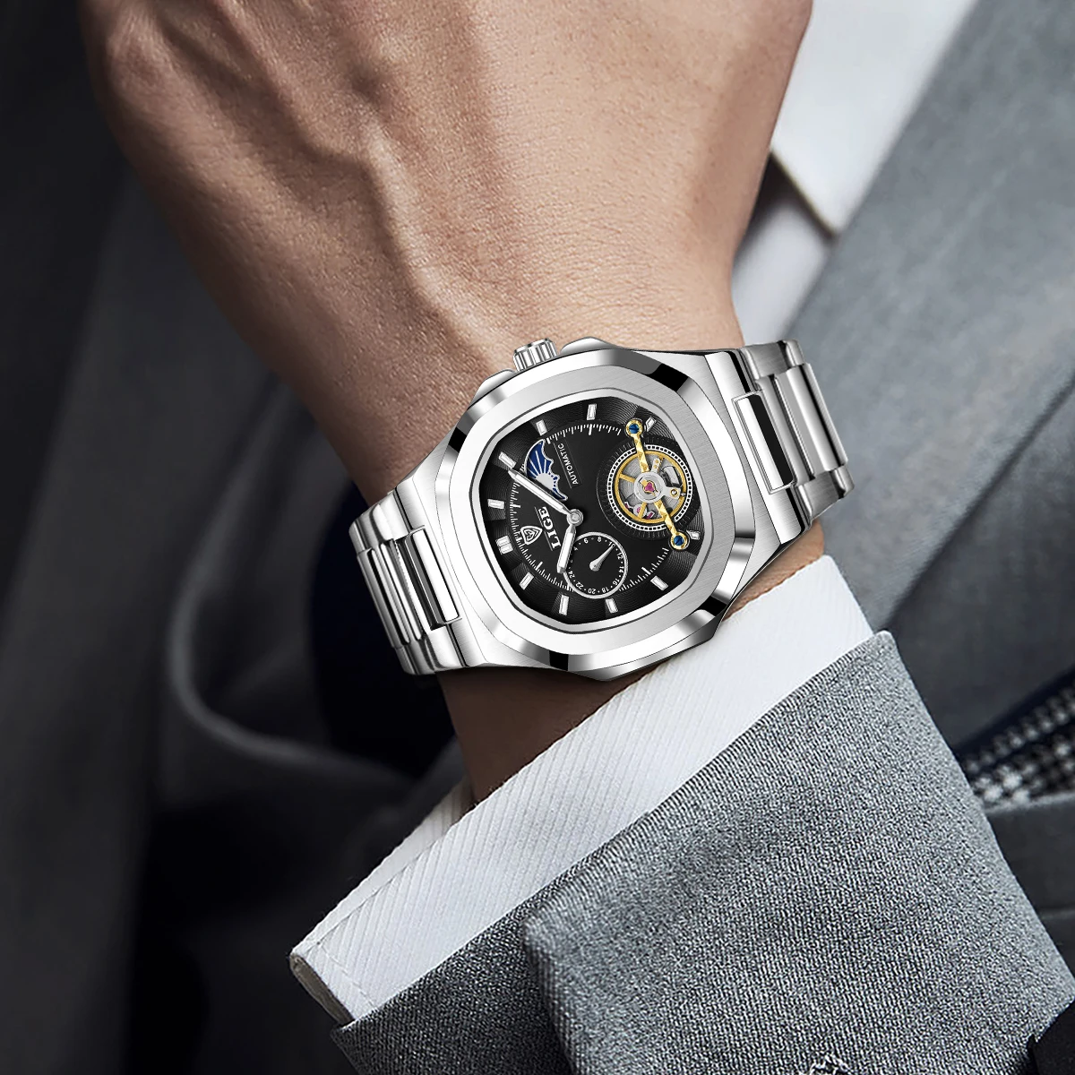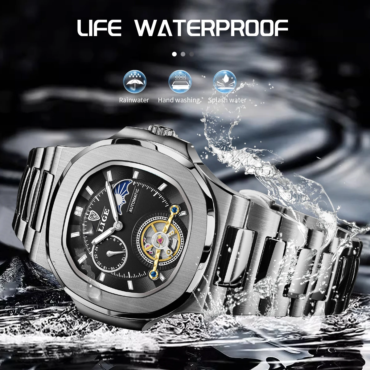 LIGE Dual Seconds Tourbillon Watch 24 Hour Mechanical Watch Men Stainless Steel Authentic Watch Night Glow Waterproof Mens Watch