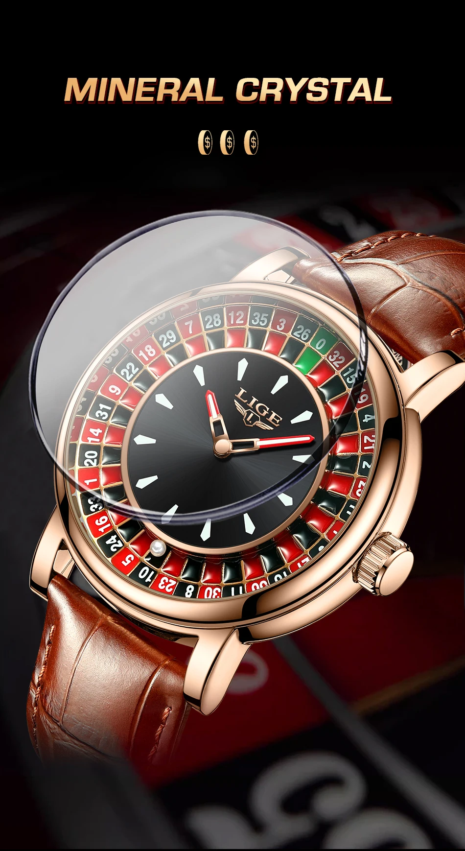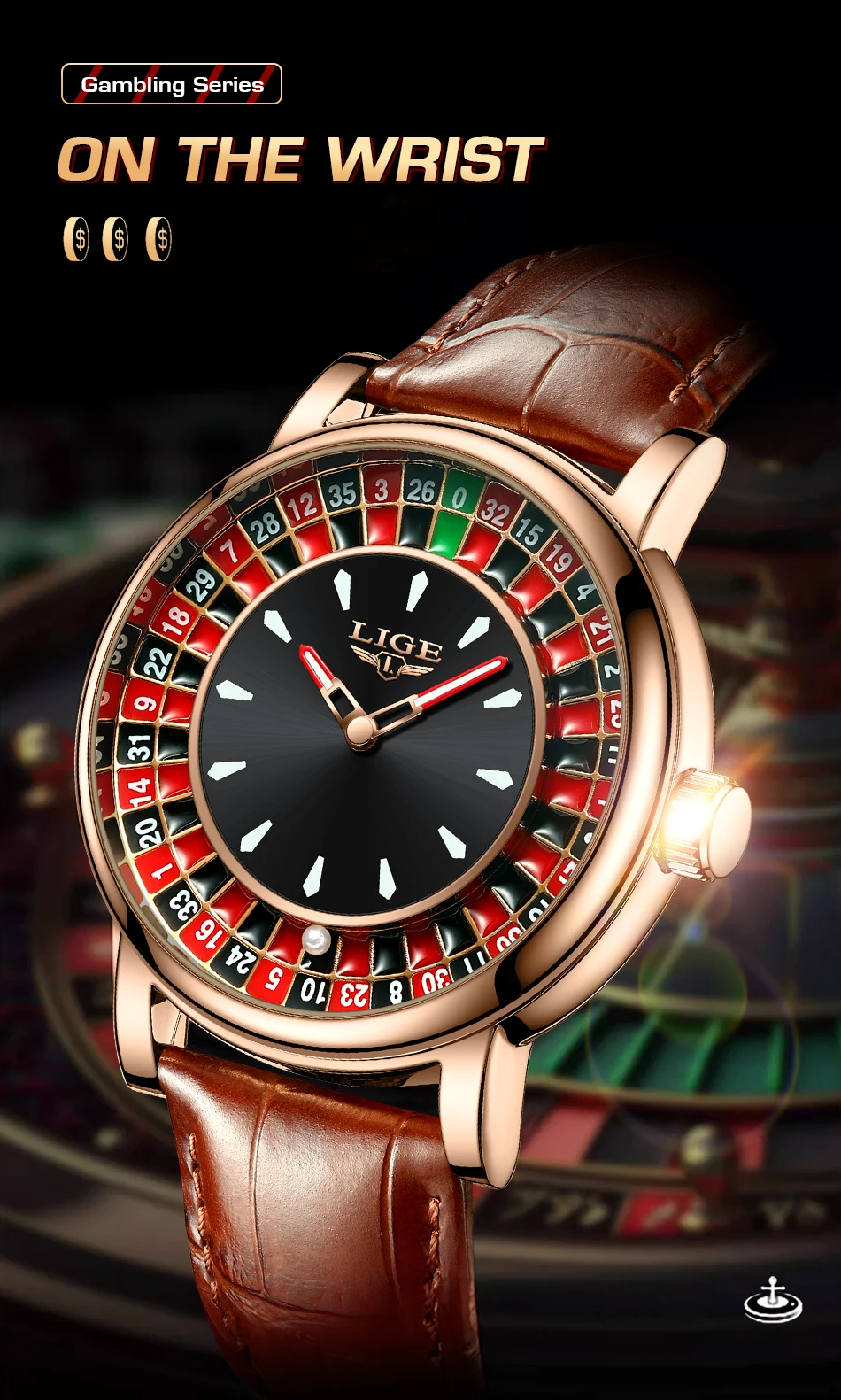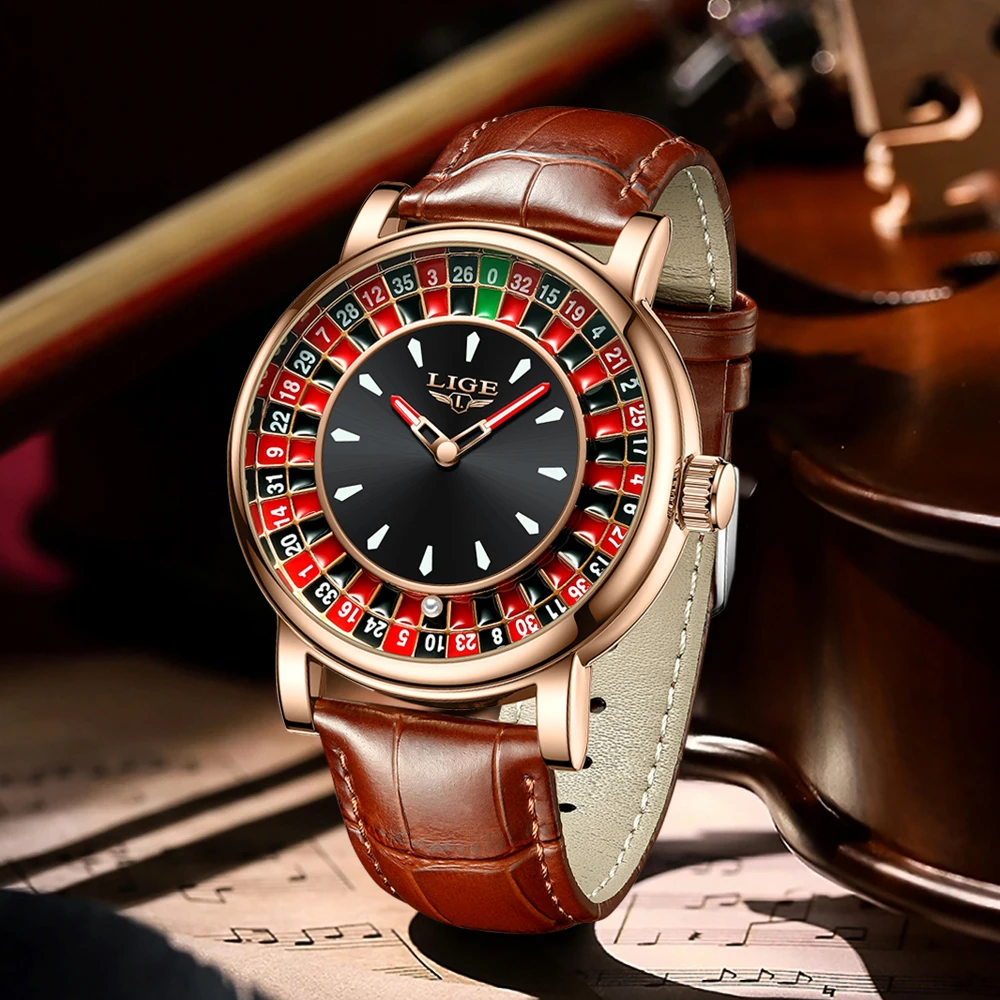 LIGE Fashion Brown Leather Men Watch Rotating Dial Las Vegas Roulette Desktop Theme Watch Men Waterproof Luminous Clock Watches