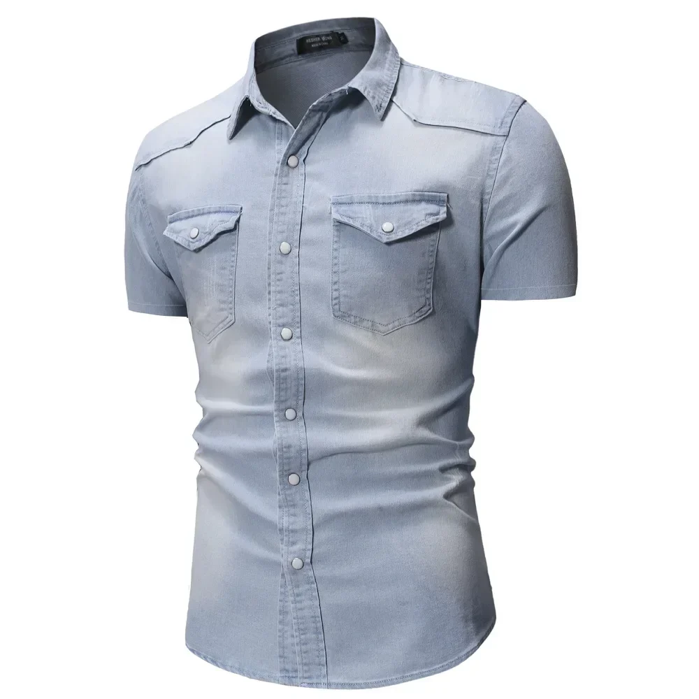 Men Denim Shirts Tops Shirt Short Sleeve Button Turn Down Collar Single Breasted Slim Fit Solid Simple Casual Splice Top 2024