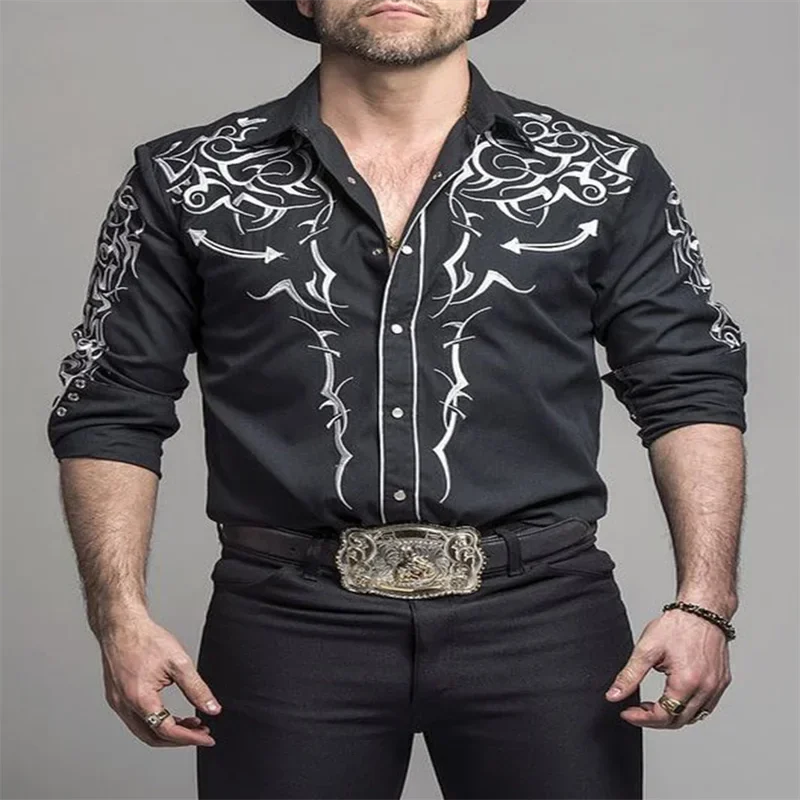 Men’s long-sleeved denim shirt, tribal ethnic style, casual, luxurious, designer design, outdoor party, 2025 blusas masculina