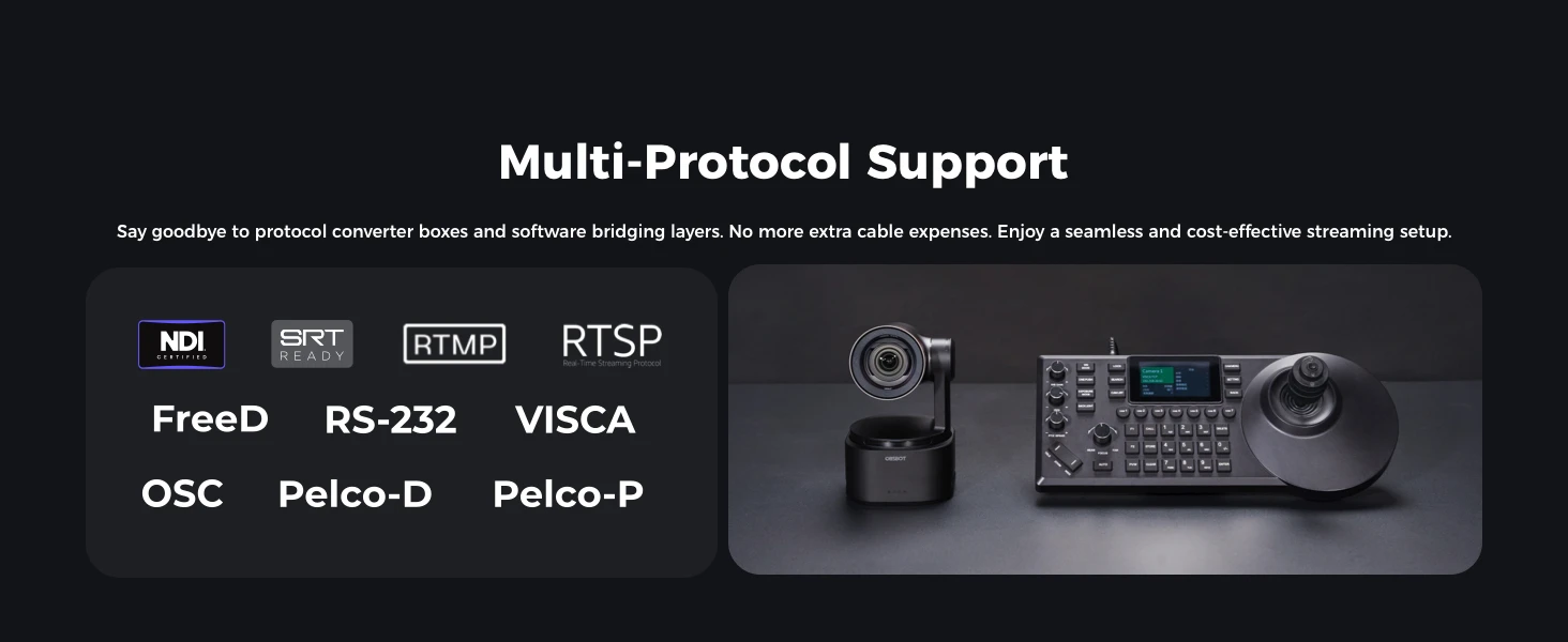 Simply connect your OBSBOT products for an extremely compact, convenient, and smart streaming setup. The OBSBOT ecosystem, with Tail 2 integration, simplifies multicam video production, camera control, program direction, and video distribution. Start professional live streaming anywhere, anytime, with minimal crew requirements.