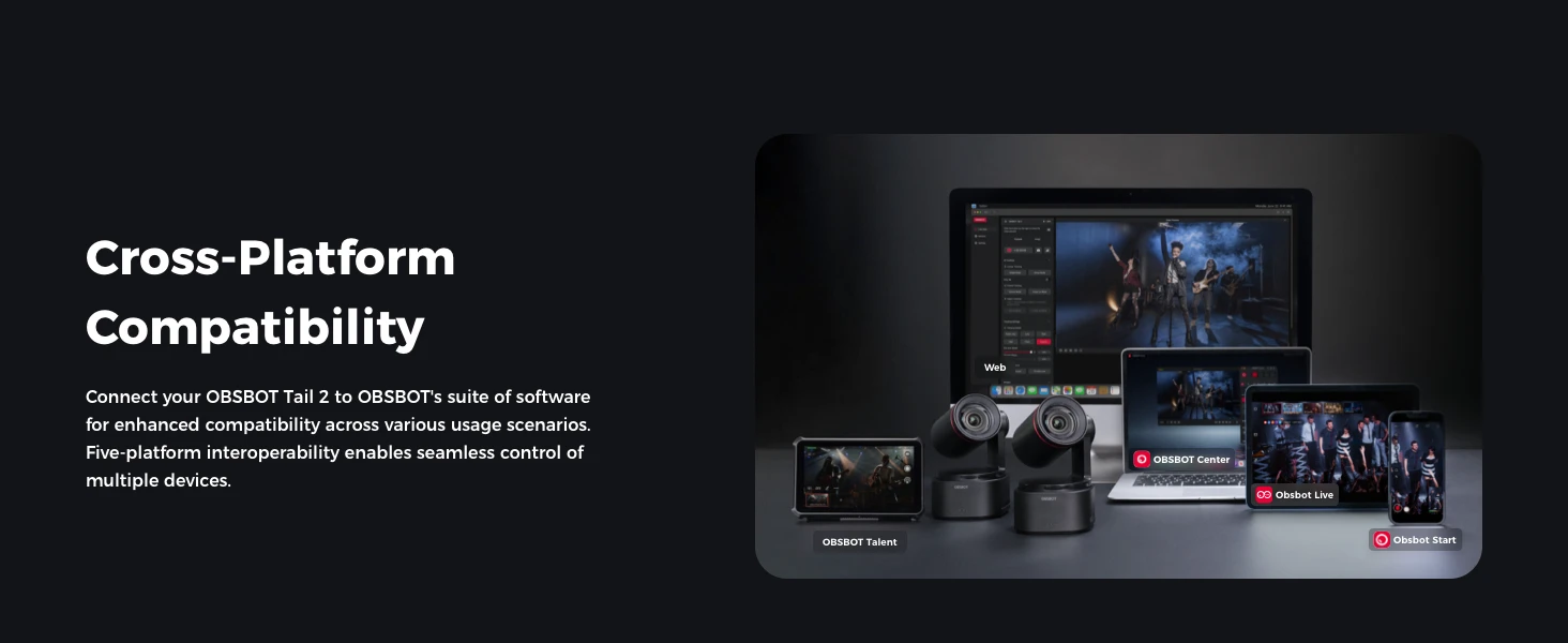 OBSBOT provides a software suite to control the Tail 2, including OBSBOT Start console software, OBSBOT Live for multicamera streaming, and OBSBOT Center for compatibility and control of all OBSBOT devices.