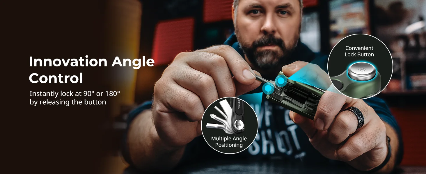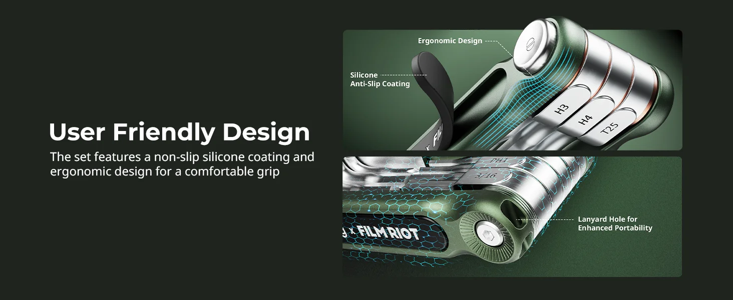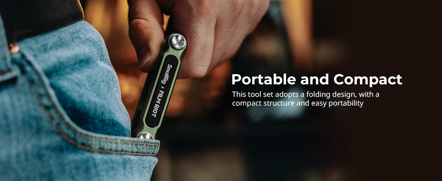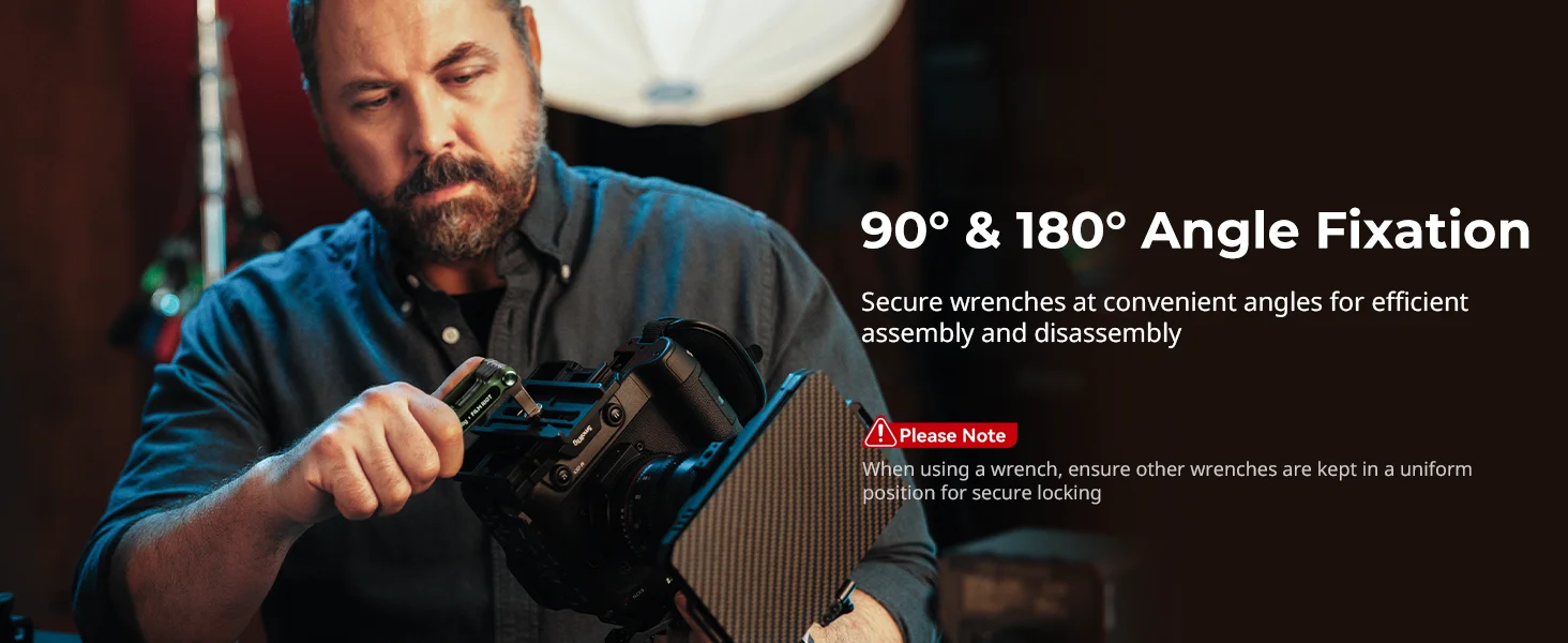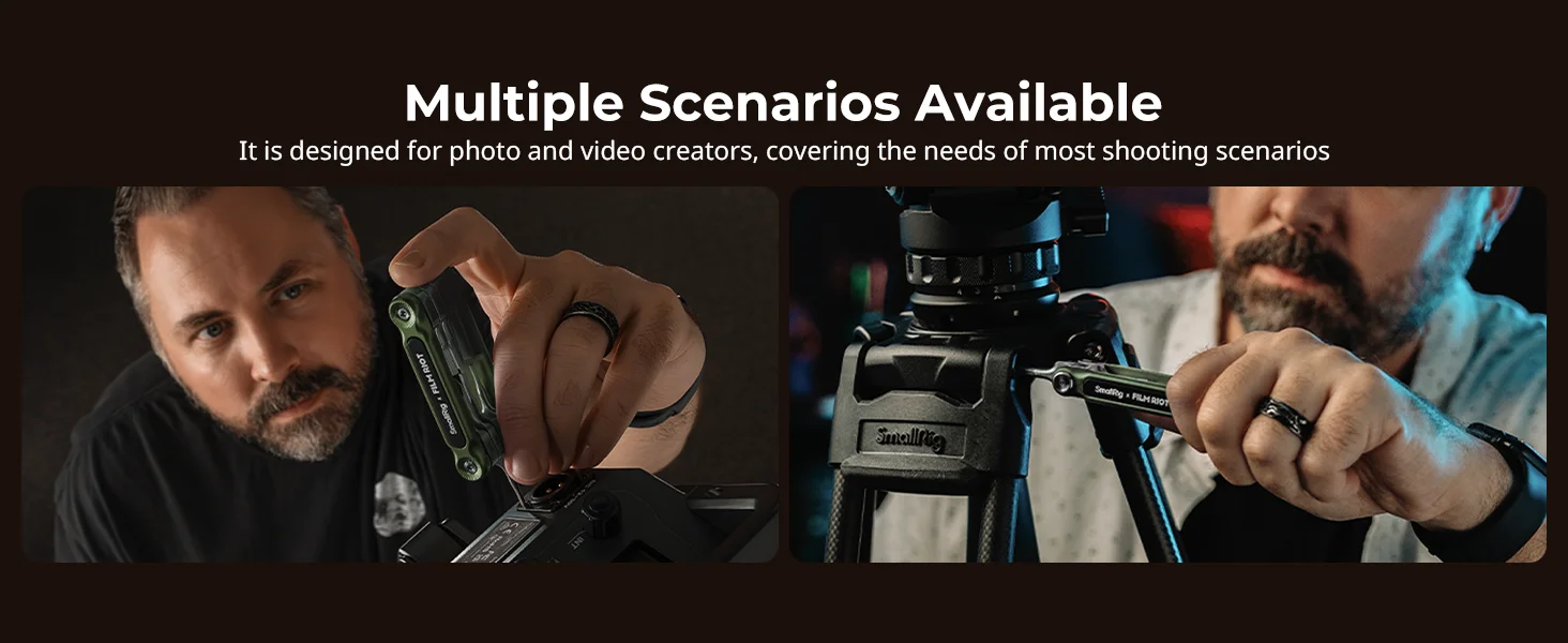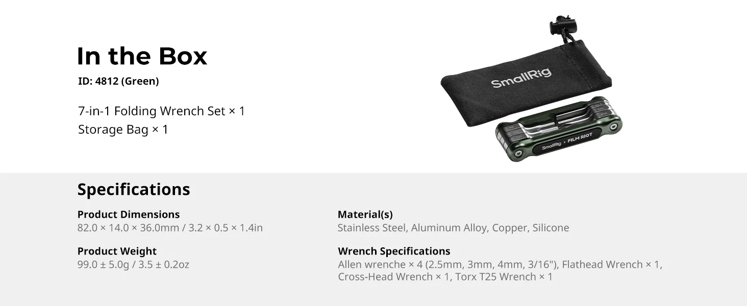 SmallRig x FILM RIOT 7-in-1 Folding Wrench Set with Multiple Angle Positioning (Green) 4812 is designed specifically for photo and video creators. The 7-in-1 set features a folding design that ensures portability and convenience, covering common wrench sizes in the photo and video industry. With an exclusive patented structural design, each wrench can be securely positioned at 90° or 180°, facilitating efficient accessory assembly and disassembly pre- and post-shooting.