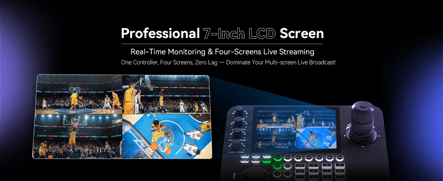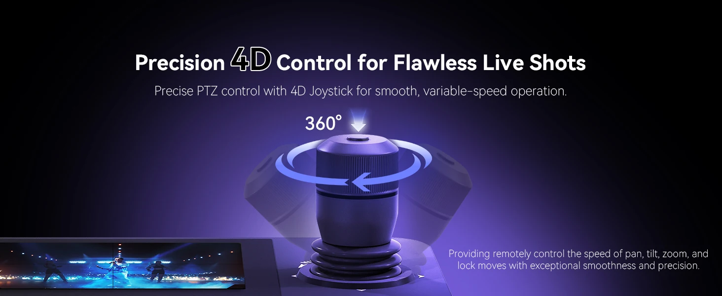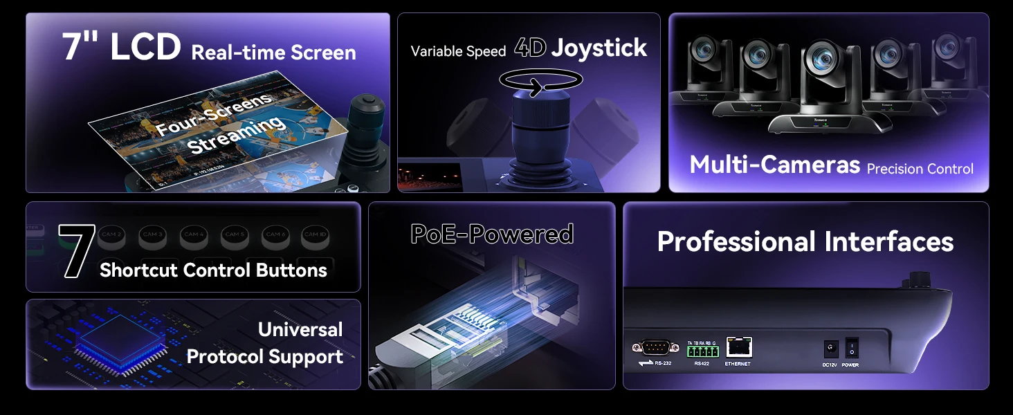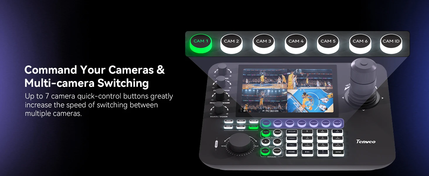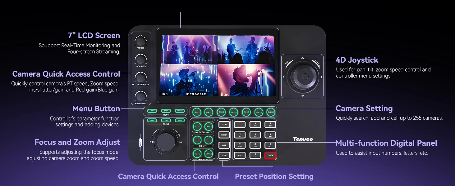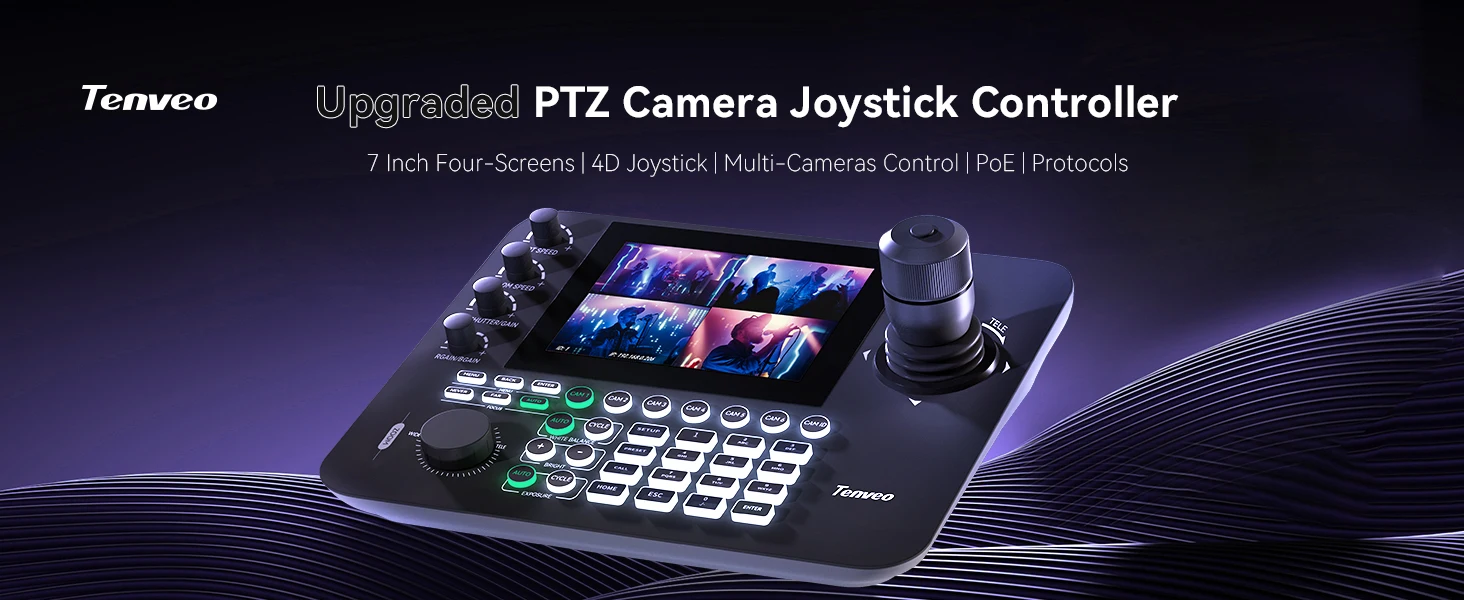 The Tenveo PTZ Camera Joystick Controller features an intuitive 4D joystick and 7” LCD screen preview, supporting Quad-Screen real-time preview of current viewing, allowing you to effortlessly control and adjust your camera angles with utmost precision, resulting in smooth and professional live streaming experiences. You can easily pan, tilt, zoom, focus, Iris, backlight, presets, PTZ Speed, and quick PTZ Camera select according to your needs.