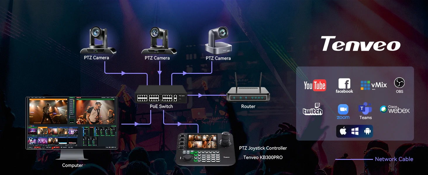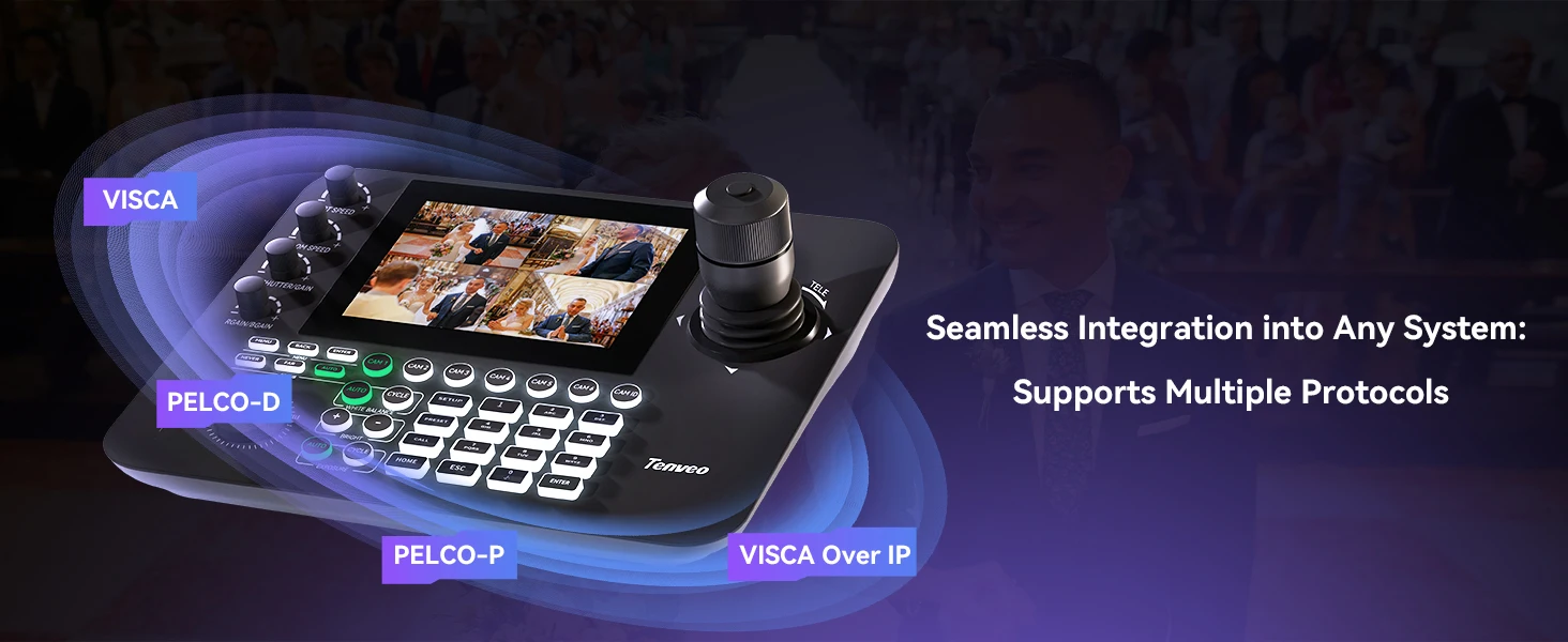 The PTZ Controller support network and analog two control modes. With support for a wide array of protocols including Visca UDP, Visca TCP, Sony Visca, NDI and Onvif for IP network control and Visca, Pelco-D/P for RS-232 or RS-485 control, this joystick controller seamlessly integrates with a variety of cameras and equipment, making it suitable for Large Conferences, church events, live streaming, OBS, vMix, Skype, Zoom, Teams, Fackbook, Youtube and much more.