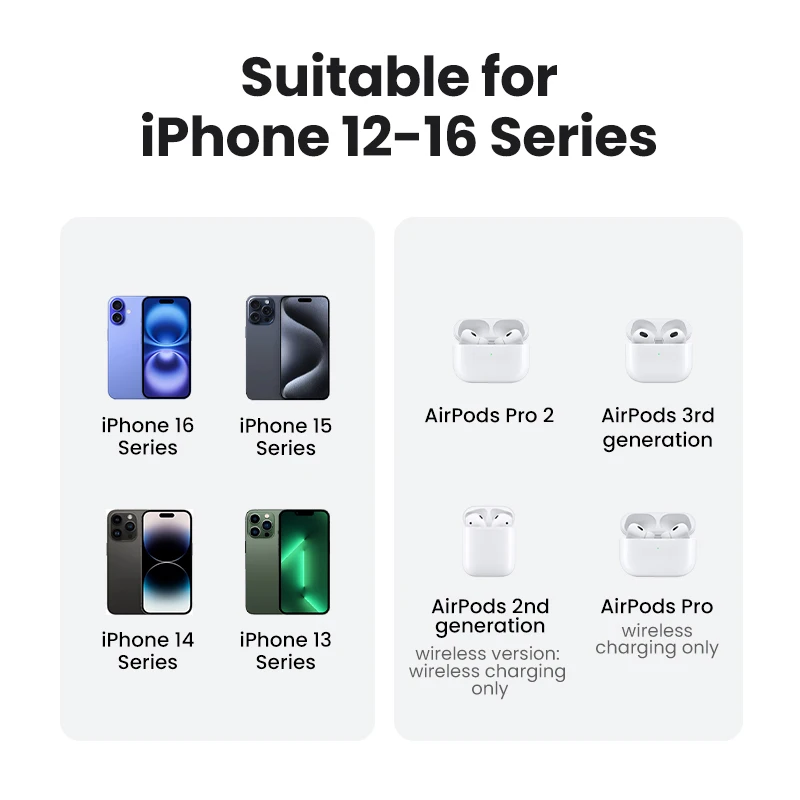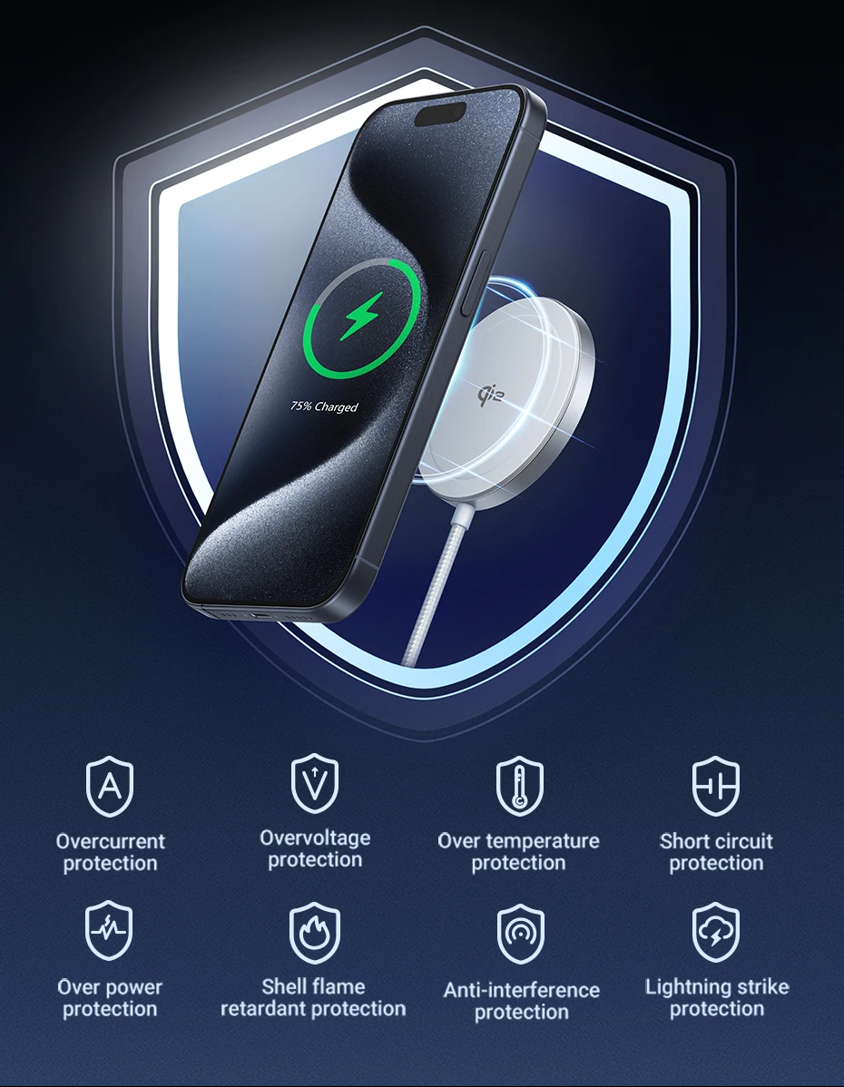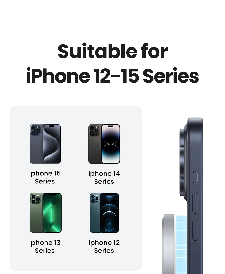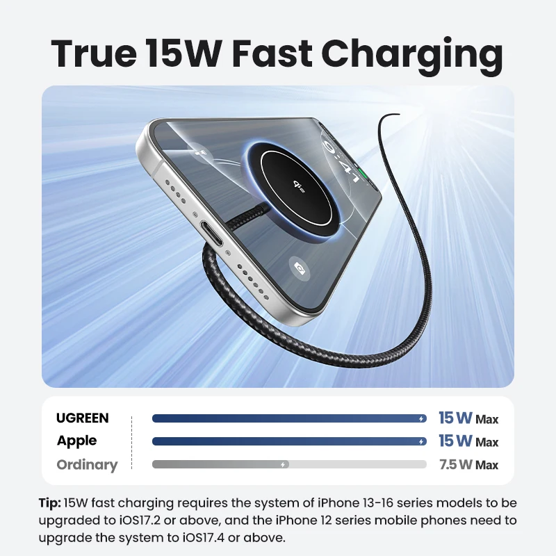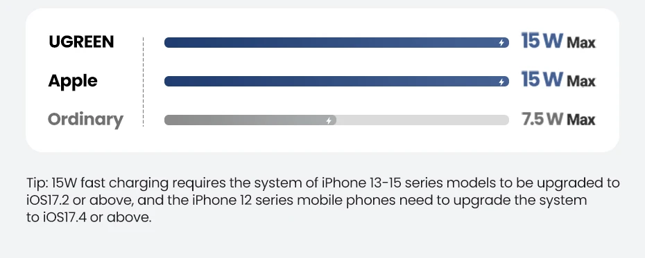 Tip: 15W fast charging requires the system of iPhone 13-15 series models to be upgraded to iOS17.2 or above, and the iPhone 12 series mobile phones need to upgrade the system to iOS17.4 or above.