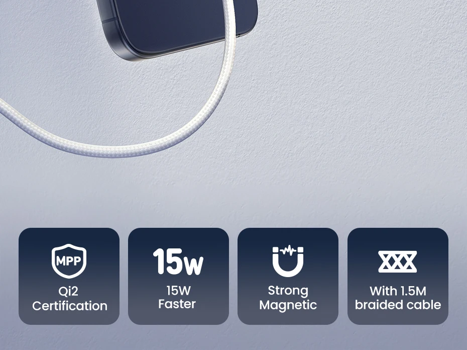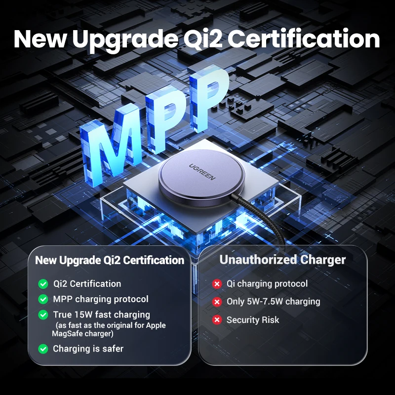 Qi2 is the latest wireless charging standard officially released by WPC (Wireless Power Consortium) on March 21, 2023. Compared with the previous Qi1 protocol, Qi2 is based on the development of MagSafe magnetic charging technology and introduces MPP (magnetic power profile) technology, which can support 15W wireless fast charging for iPhone 12-15 series mobile phones.