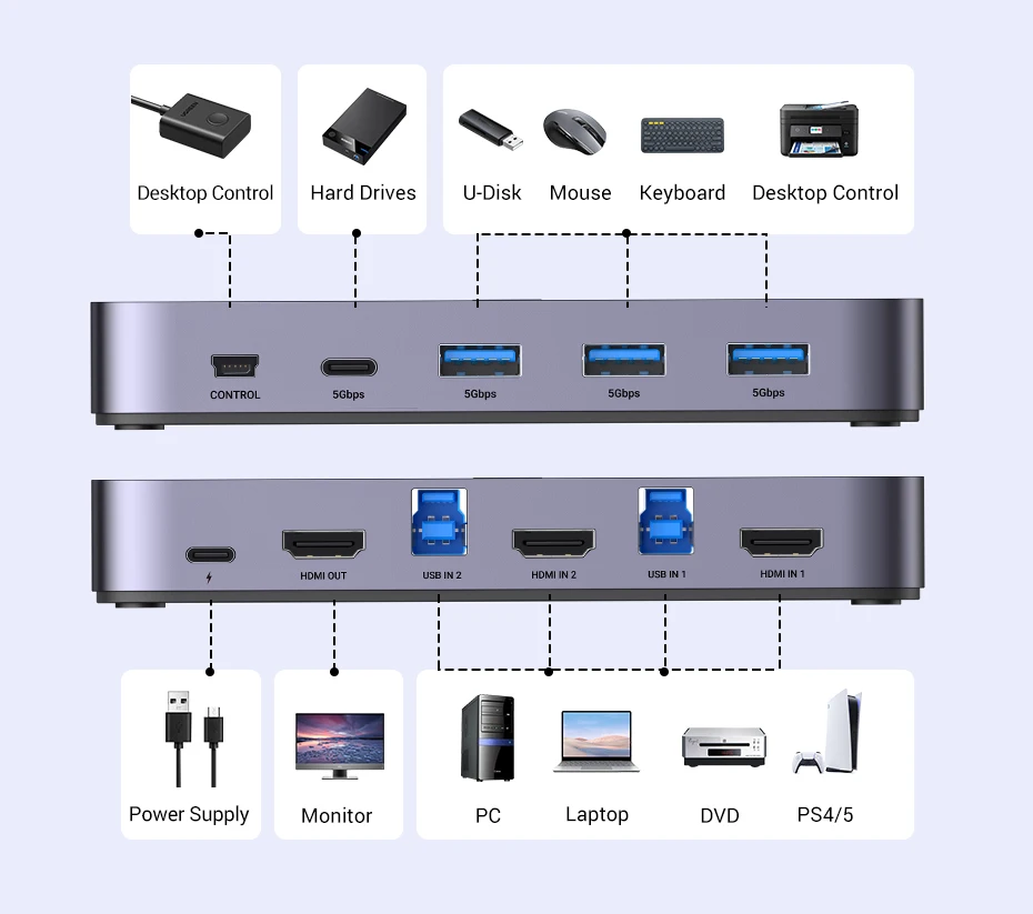 - HDMI 2.0 KVM Switch: 2PCs share 3 USB-A devices + 1 USB-C devices and 1 monitor
