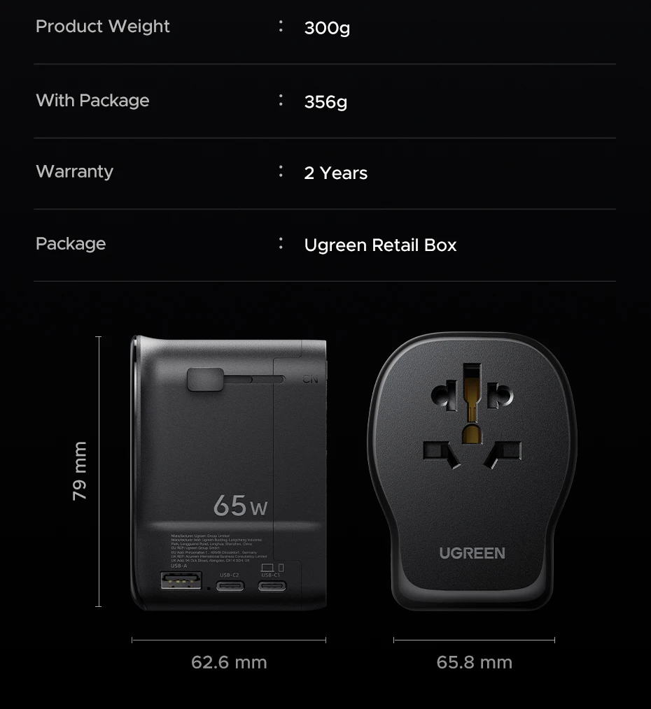 UGREEN 65W GaN Universal Travel Adapter 2 USB-C 1 USB-A AC Socket Charger Certified CE FCC UKCA TÜV For EU US UK Grounded Plug