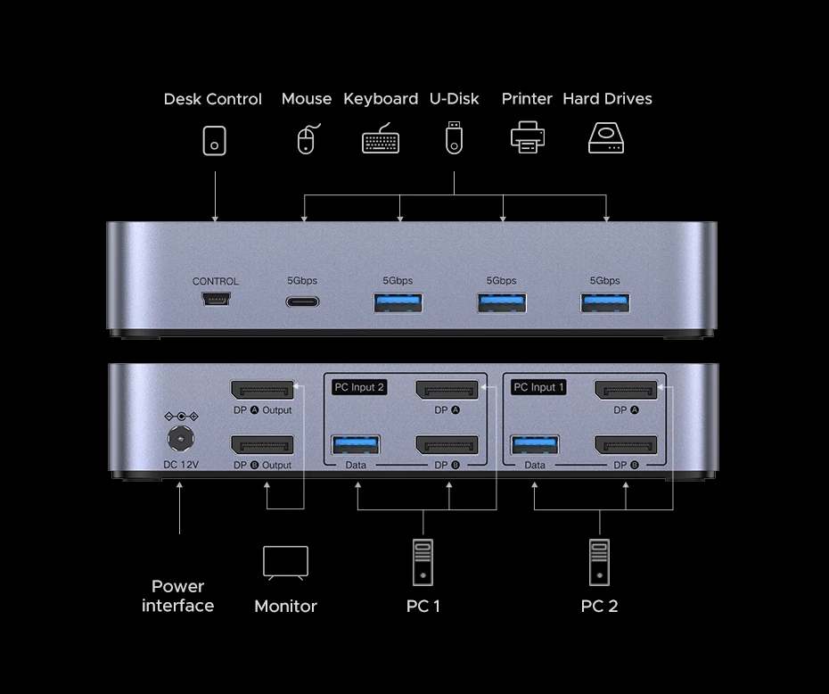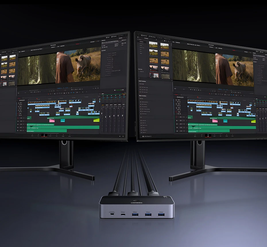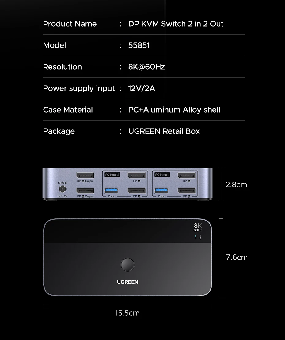 UGREEN DP KVM Switch 2 Monitors 2 PCs 8K 60Hz USB 3.0 Sharing Keyboard Mouse Monitor with HDR 3D for Laptop Desktop Printer
