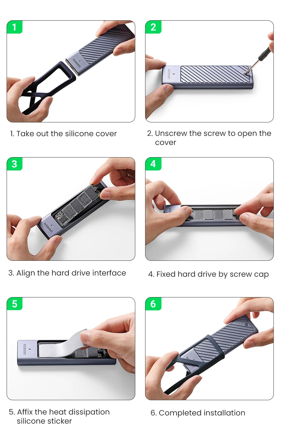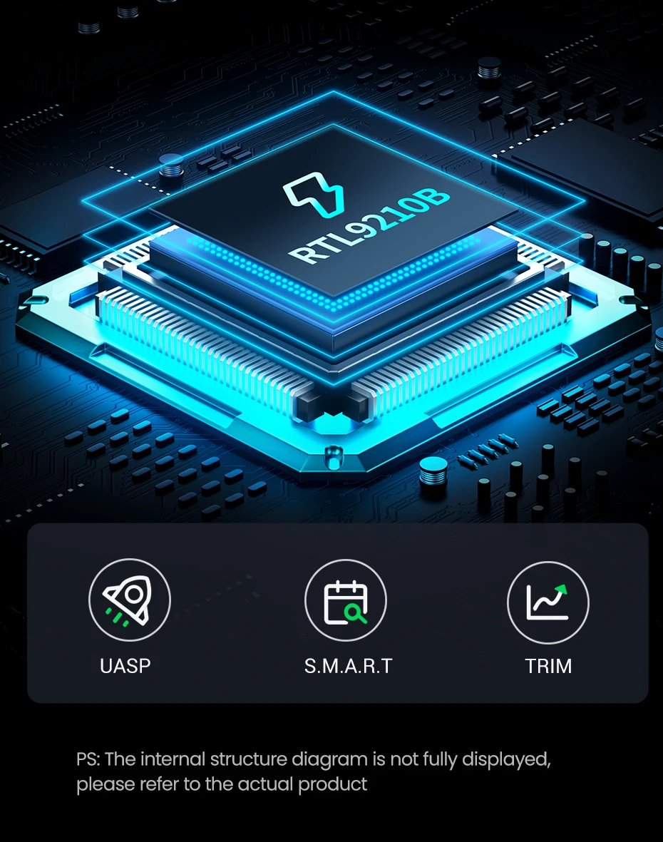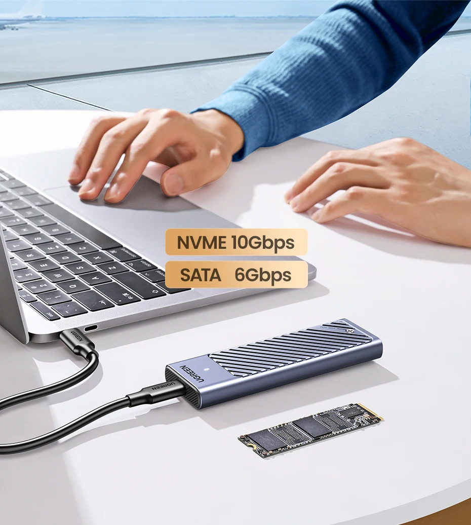 With the latest USB 3.2 Gen2, this M.2 enclosure can achieve a 10Gbps data transmission rate as an NVMe enclosure and 6Gbps with SATA protocols