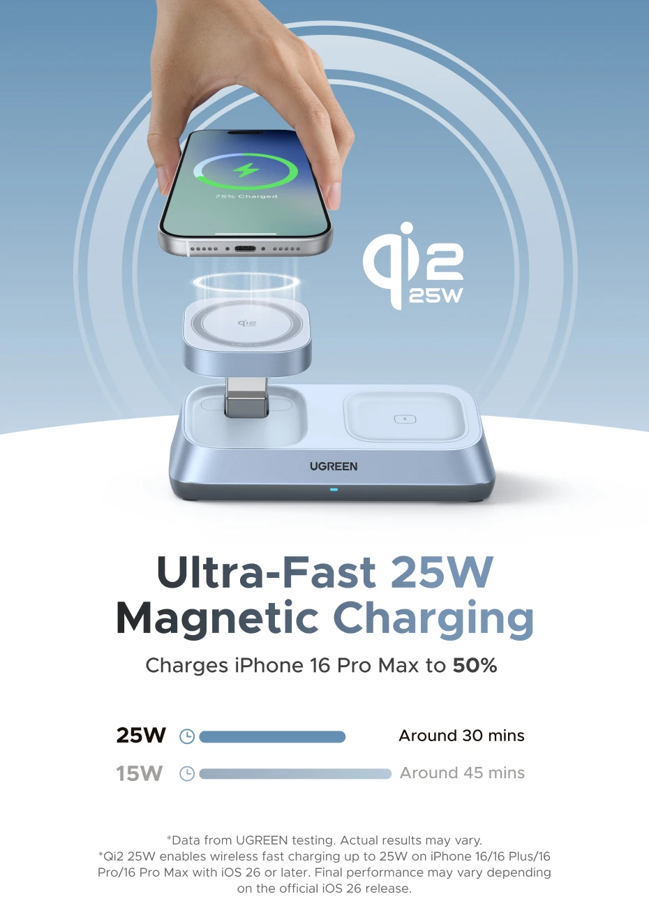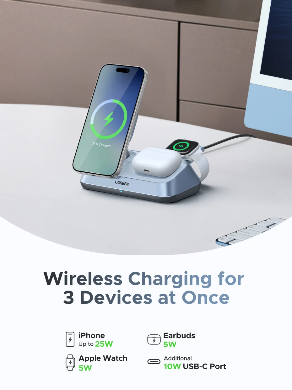 UGREEN Qi2 25W MAX Magnetic Wireless Charger Stand 3- in-1 Charging For iPhone 17 Pro Max/AirPods 4 For MagSafe Fast Charger