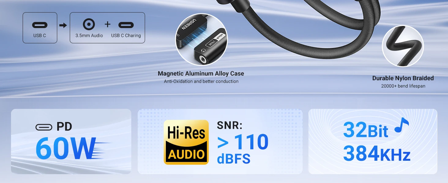 UGREEN USB Sound Card Type C to 3.5mm AUX Cable Adapter Earphone Converter DAC Chip PD QC Charging Sound Card for Headset