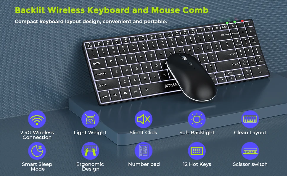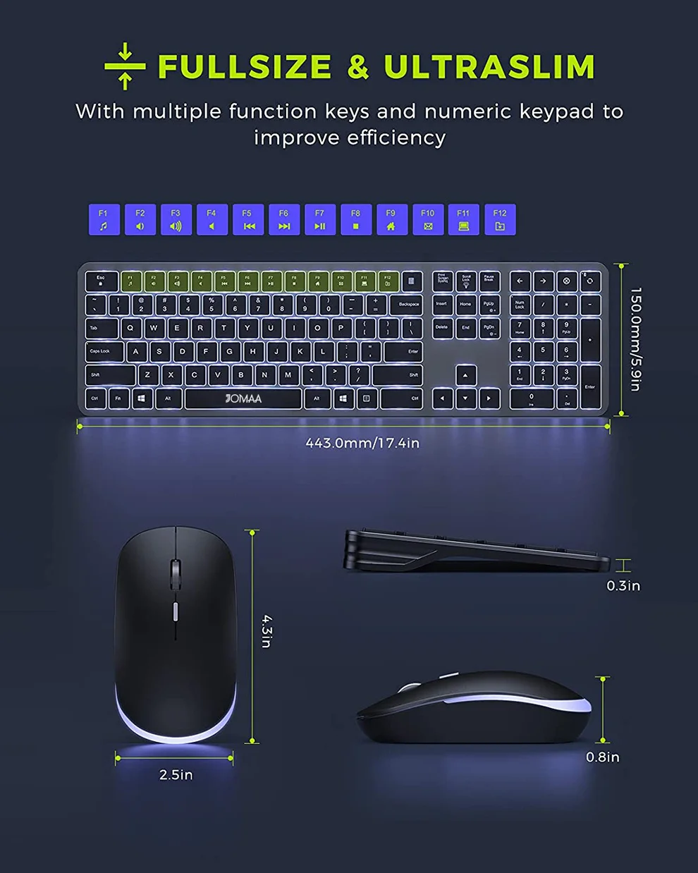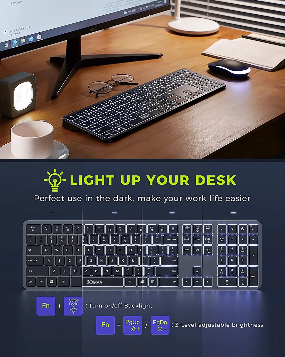 • Backlit Wireless Keyboard and Mouse Combo – The white backlight is bright and evenly distributed, without glare, less light pollution than color backlit, protects your eyes, and more convenient to type in low-light environments. Ideal for studio work, office and home. Adjustable 3-level brightness: low-mid-high to suit all your needs. The intelligent auto-sleep function and on/off switch on both devices are a great bonus to keep your battery life