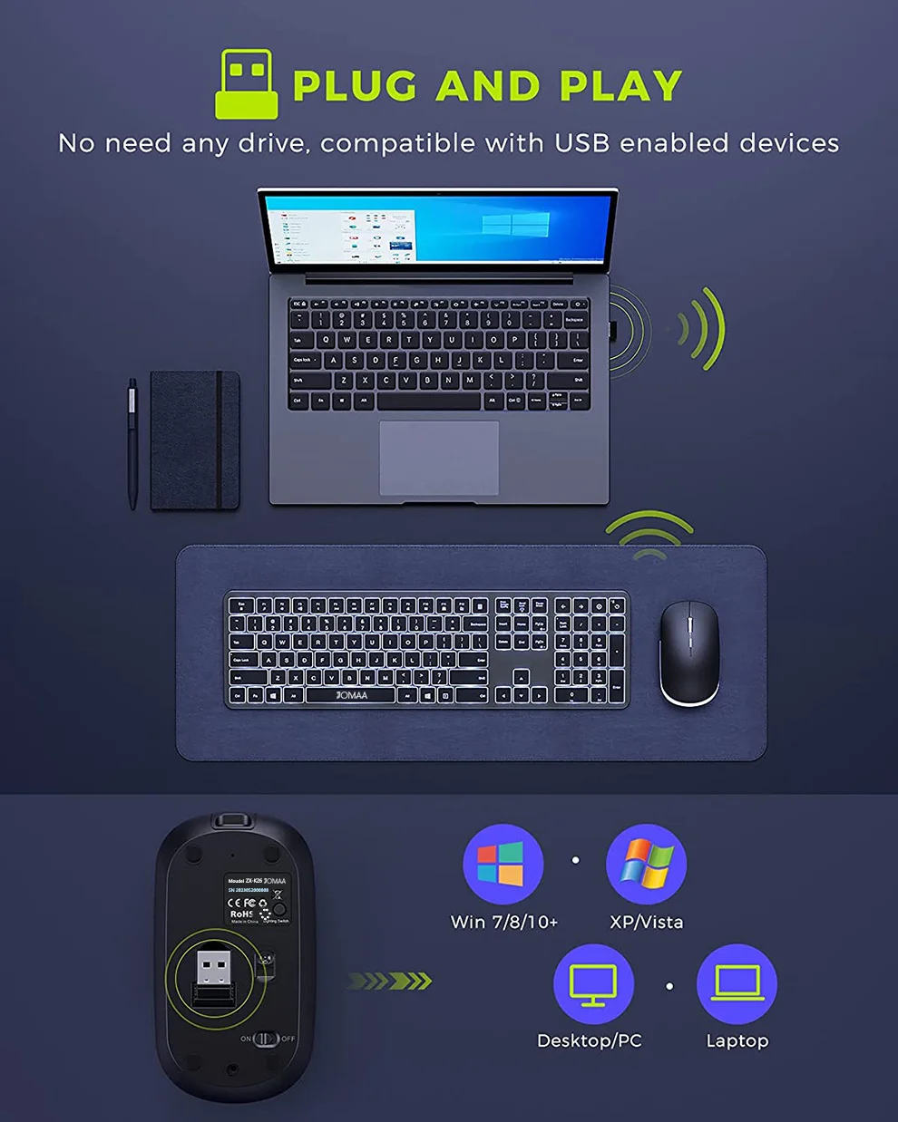 • Just plug it into a USB port and your keyboard is ready to go. The powerful 2.4G frequency provides you with a stable wireless connection, you will never experience a “lag” problem with it